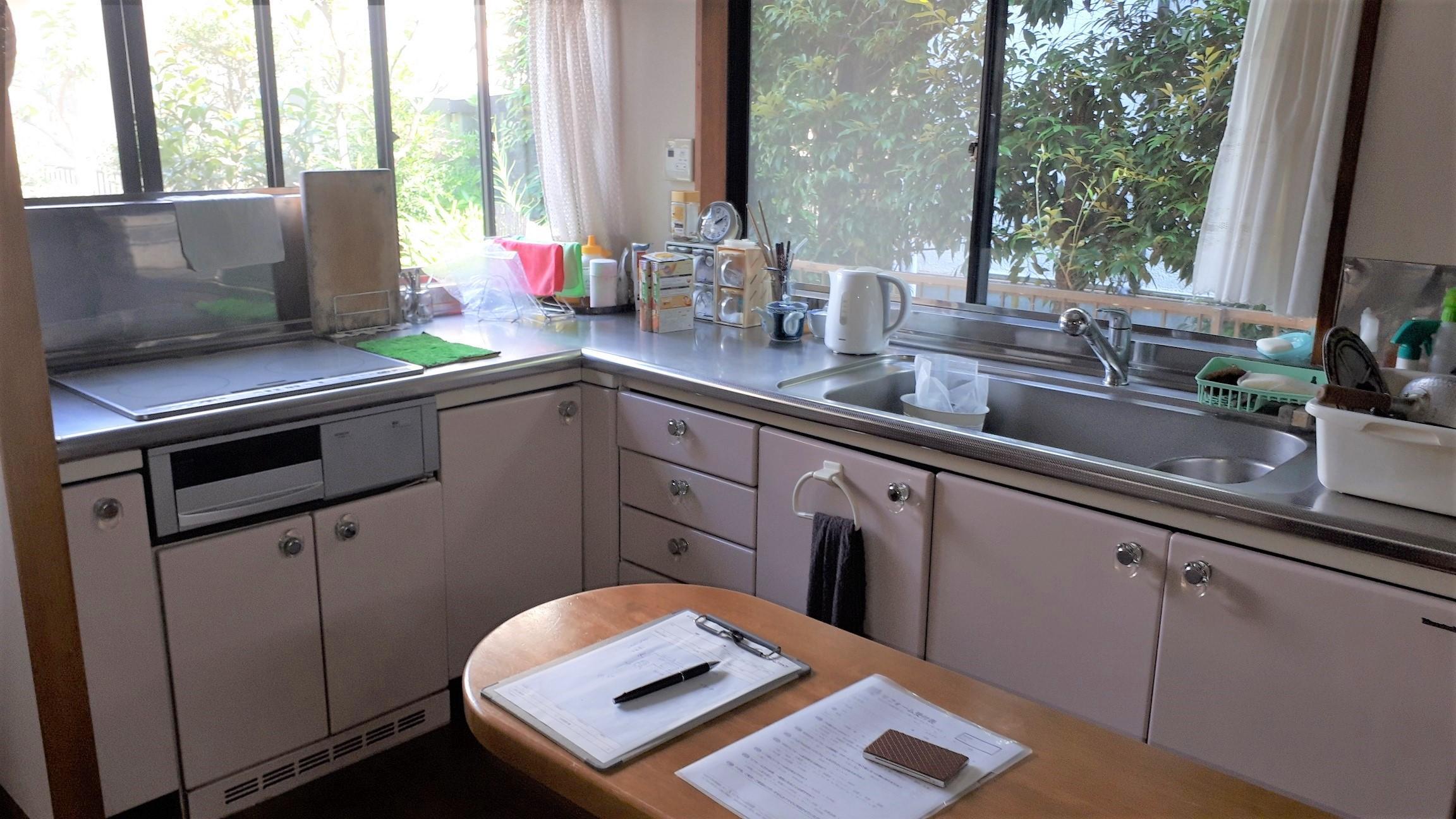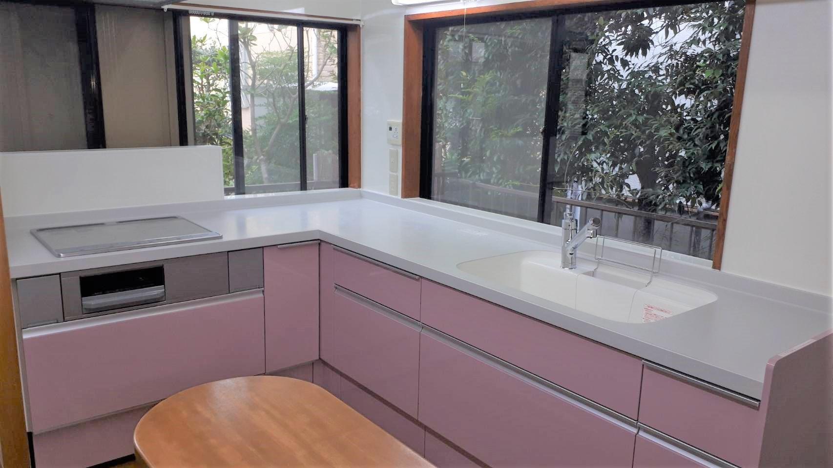 カラーはペールピンク。 優しく明るい雰囲気のキッチンに仕上がりました。