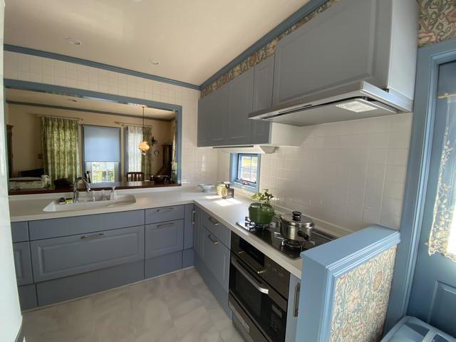 海外製のガスコンロの故障をきっかけにキッチンリフォームをご検討され、奥様がお気に入りのウイリアムモリスの壁紙、