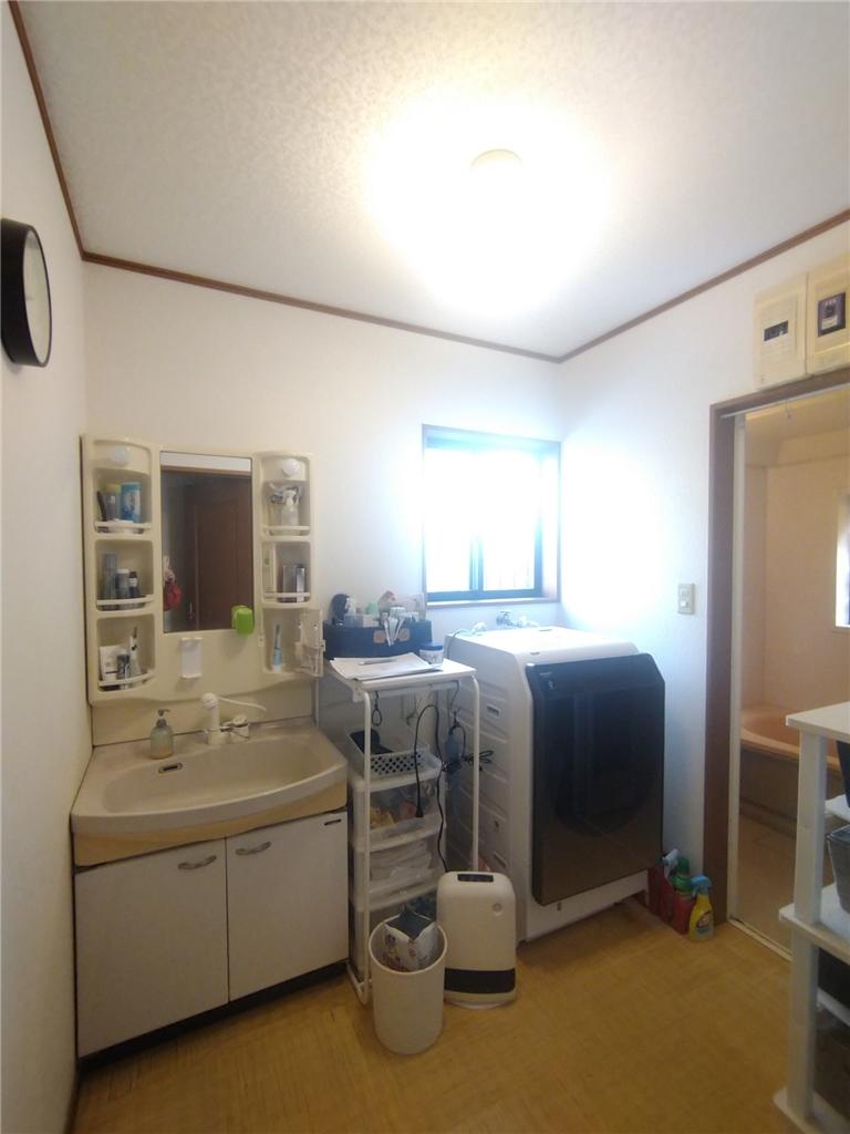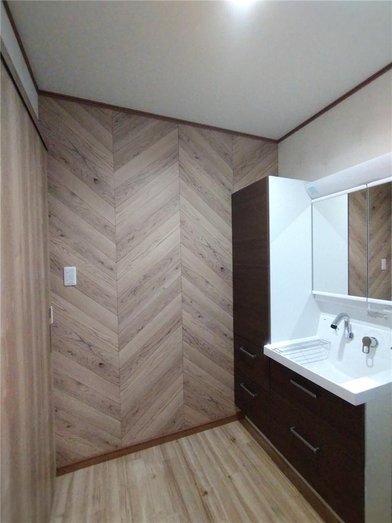 クロス、床、洗面化粧台のカラーが以前とはがらりと変わり 素敵な空間になりました。 洗面化粧台にはトールキャビネットを追加、 収納力が増え、見た目もスッキリです。