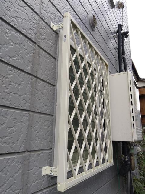 1階の窓に面格子を設置させていただきました。 これで2階に居ても安心して換気のために窓を 開けておくことができます。 商品:アルミ、ヒシクロス、ホワイト
