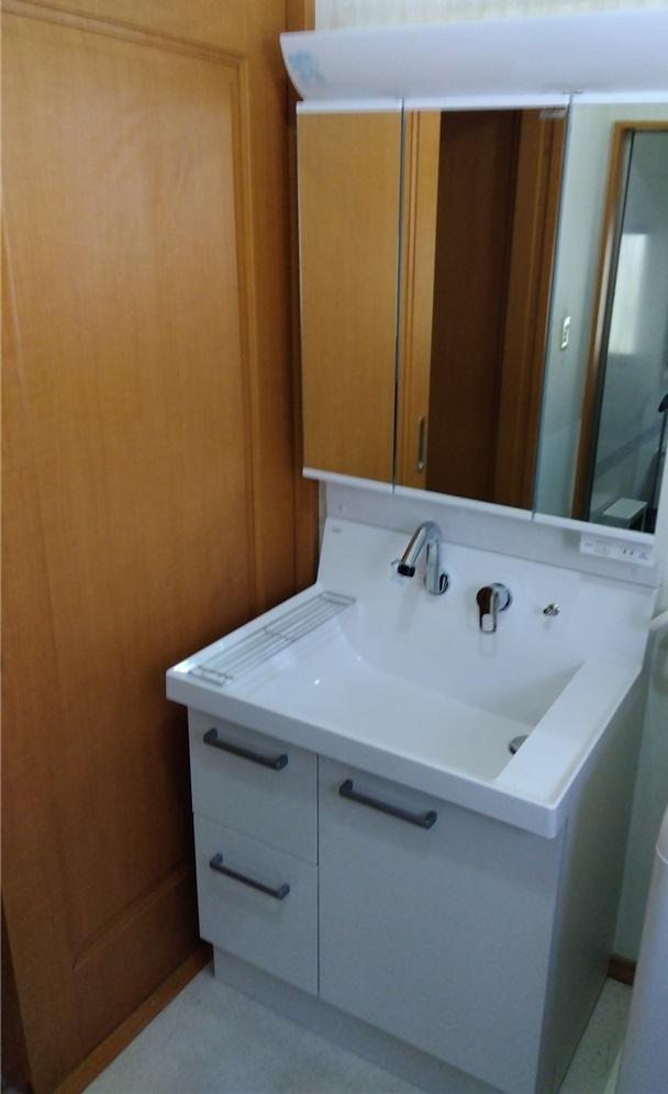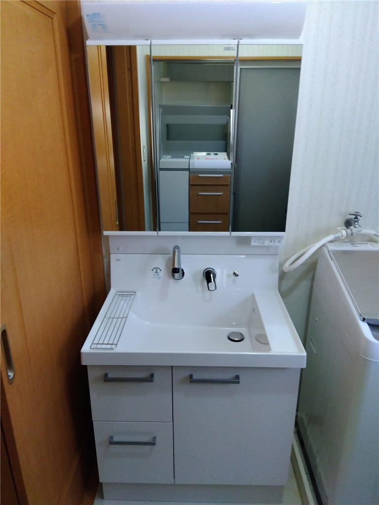 古くなった洗面化粧台のリフォームです。 ショールームにご来店いただき、 実機をご見学され、お手入れ簡単、 将来的にキレイが続くハイバック水栓をご選択されました。
