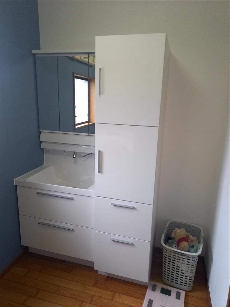 浴室とご一緒に、洗面室もリフォームされました。 壁紙のネイビーに白いエルシィが映えて、 とても清潔感のある空間になりました。