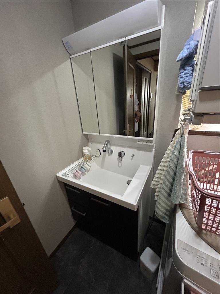 冬の寒さにより、浴室のリフォームです。 アクセントパネルがとてもシックなイメージで素敵な空間となりました。 洗面化粧台もピアラに交換されました。