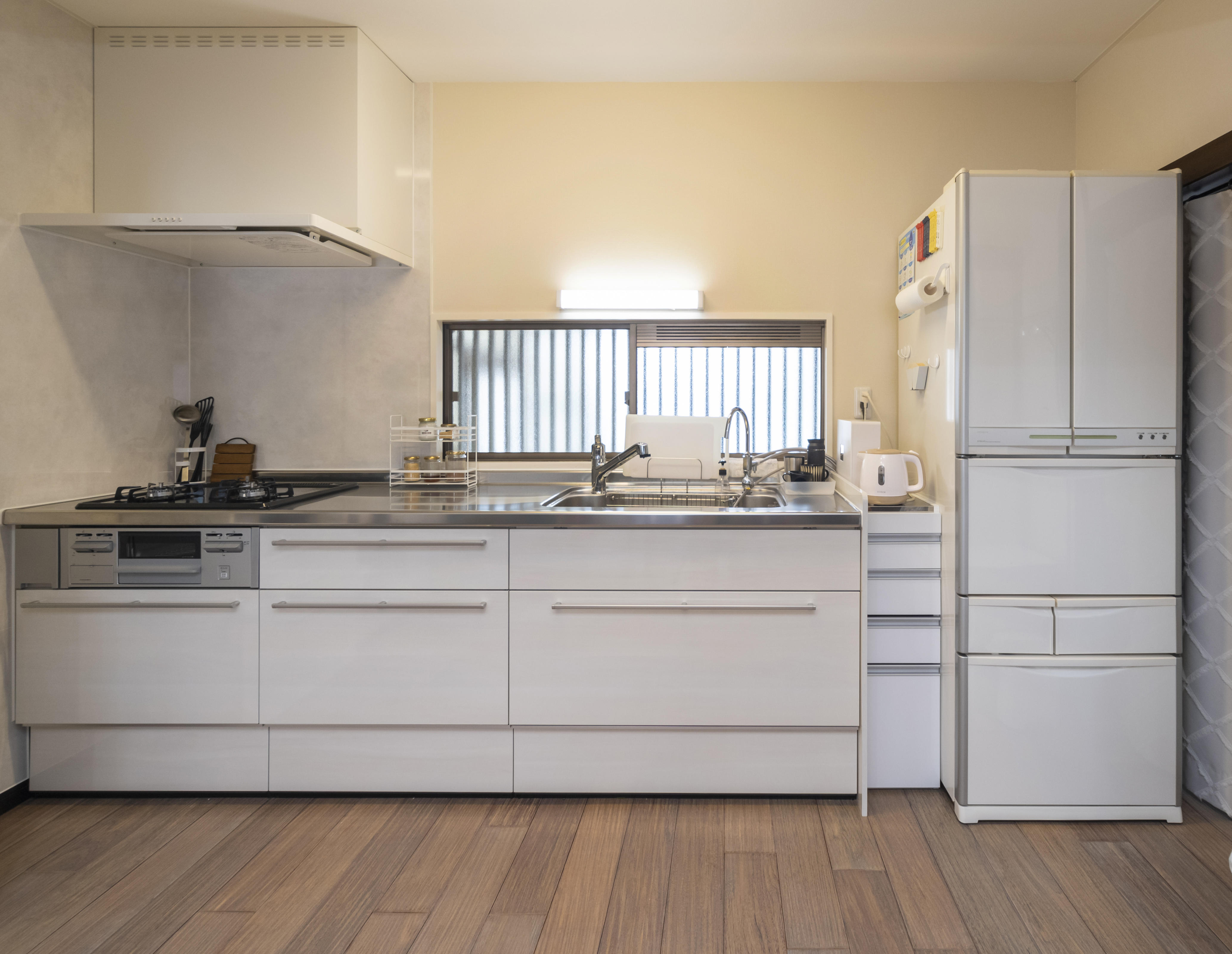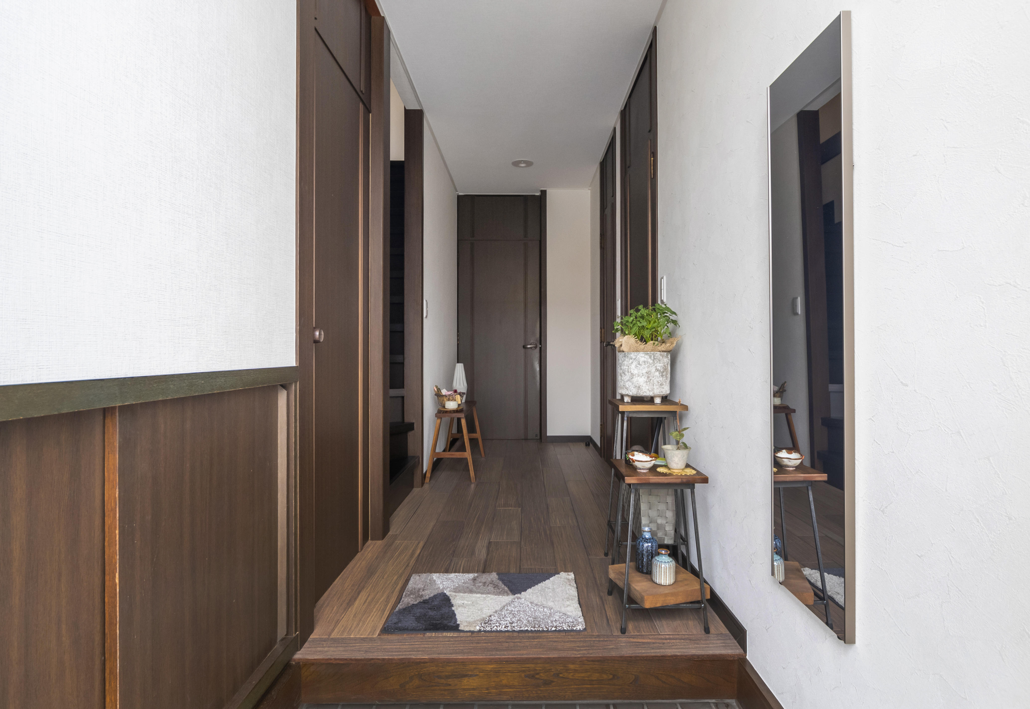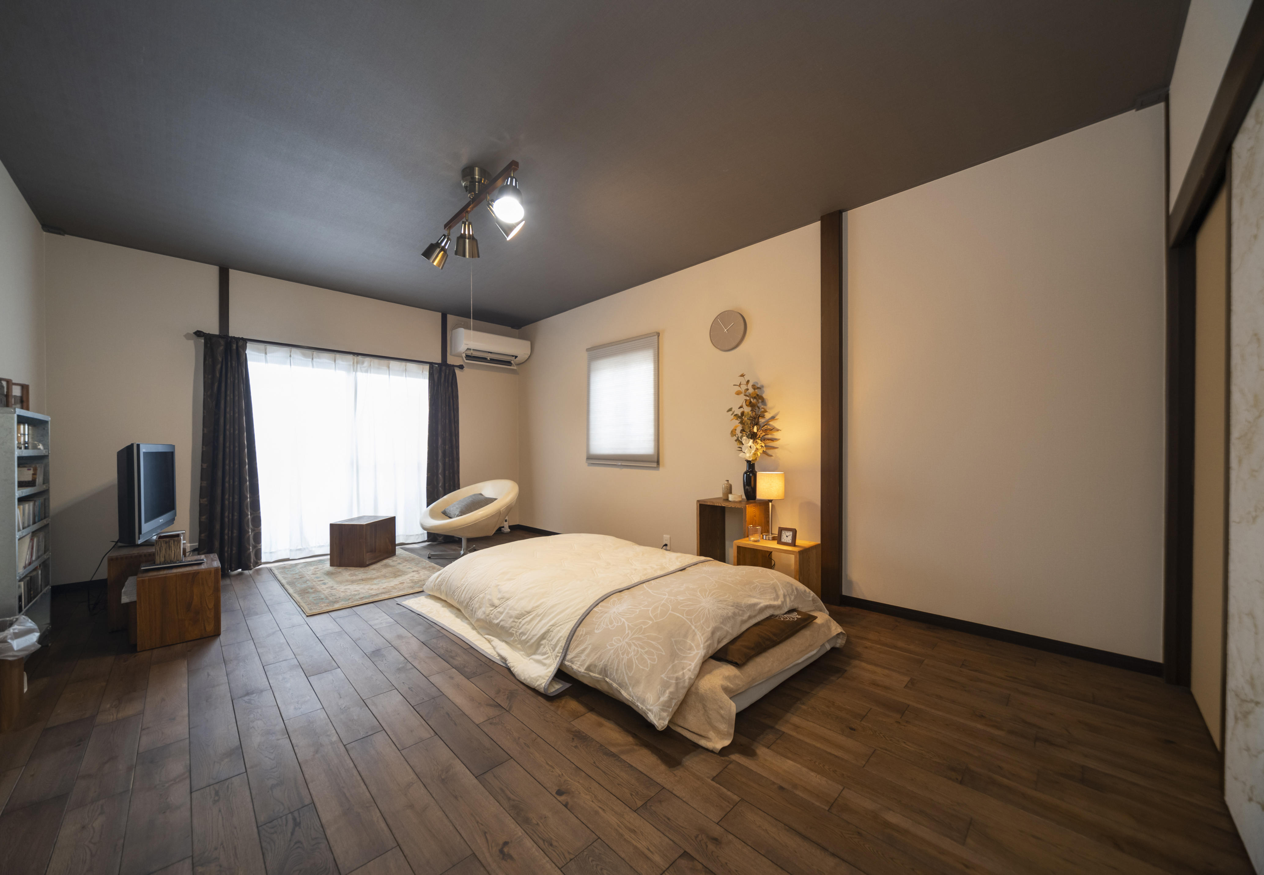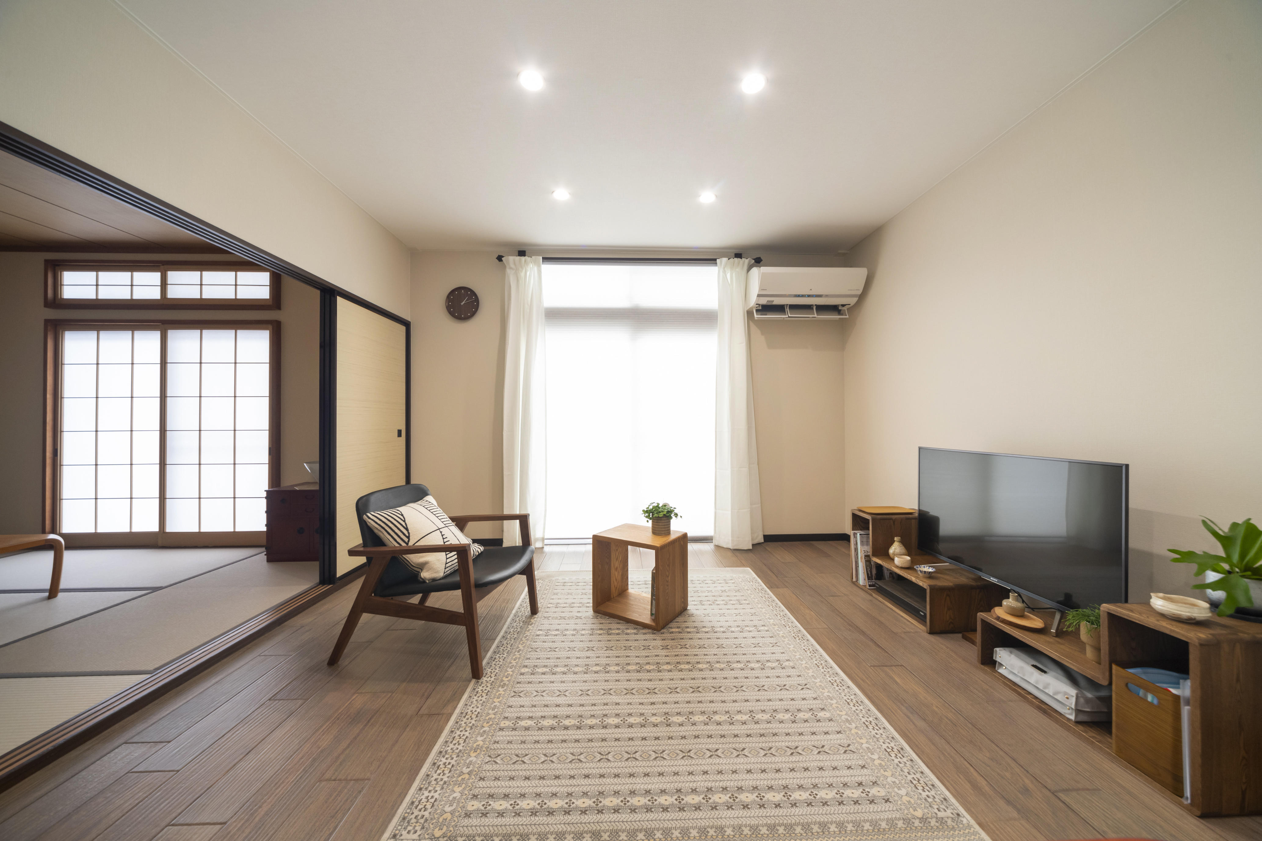 既存の間取りを活かし、住宅性能を高めるリノベーションをしました。 床や壁のクロス張替えを行いまるで新築のように生まれ変わりました。 床にはダークブラウンの無垢フローリングを使用し、温かみのある落ち着いた空間を演出しています。 設備面では、システムキッチンやユニットバスなど水回りの設備を新しいものに交換し、清潔で快適に使えるようになりました。