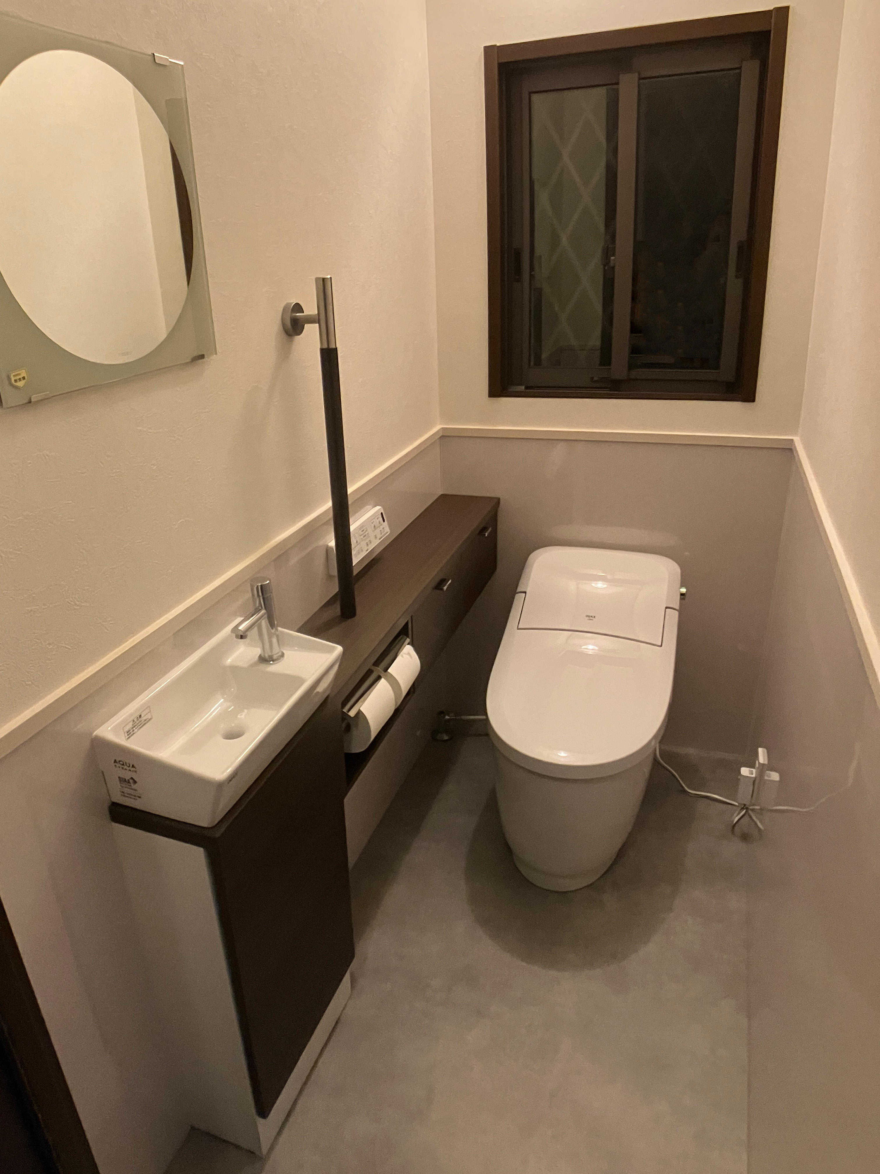 水まわり機器交換後、トイレも交換したいとご相談をいただき、トイレ本体と内装をリフォームしました。 濃い木目とグレーの色合いがラグジュラリーさを引き出し、入る度に気分が上がる空間になりました。 腰下の壁は、以前と同様にサニタリーパネルを張り、掃除しやすい仕様にし、 手洗いは便利な収納機能がついたLIXILのキャパシアを採用しました。