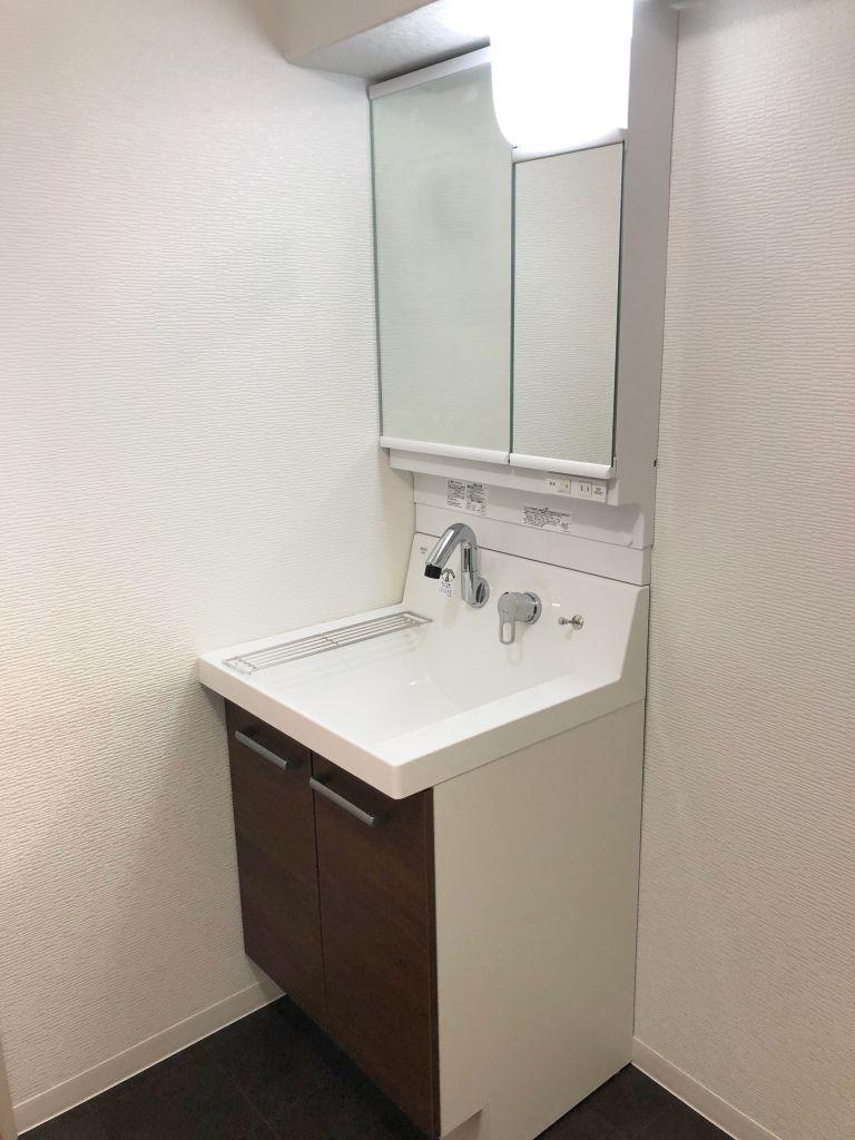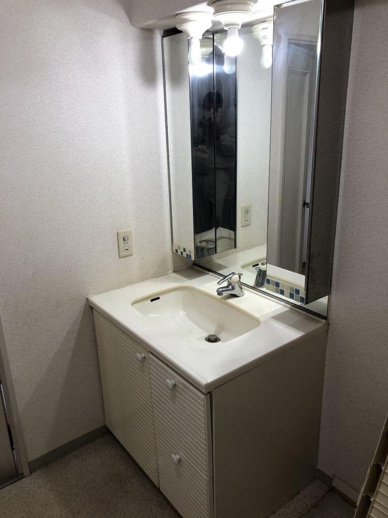 【施工内容】 白熱電球だった洗面台を収納豊富なLED洗面化粧台に変更しました。