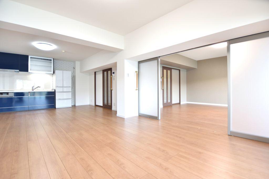 マンション2室分のマンションリフォーム工事です。キッチン、浴槽、洗面、トイレ、床、間取りにいたるまですべて新しくしました。