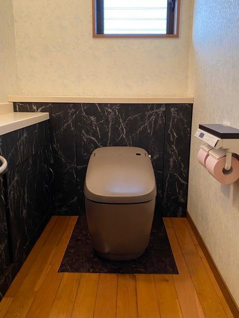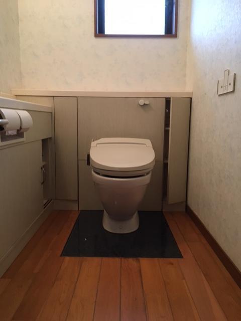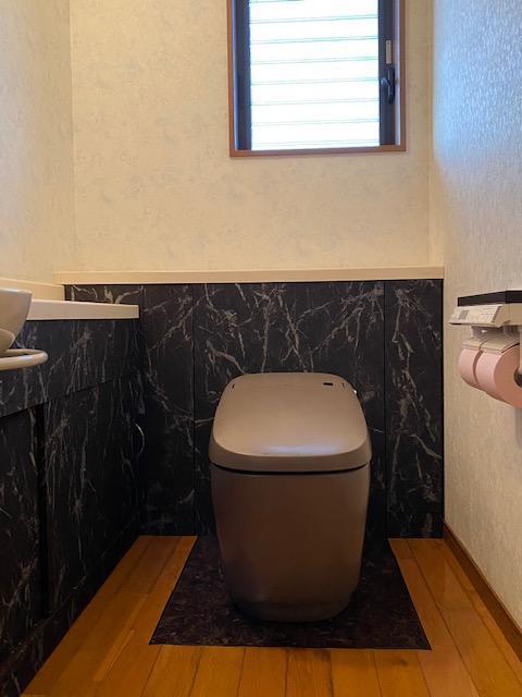 水漏れ修理がきっかけとなり始まったリフォーム。 既存の収納は生かしつつ、サティスG ノーブルトーブ色をマッチさせました。 既存の収納部は石目調のシートを貼り、便器下も石目調のサニタリーフロアに張替。 清掃性、収納、空間デザイン、お気に入りの素敵な空間に仕上がりました。