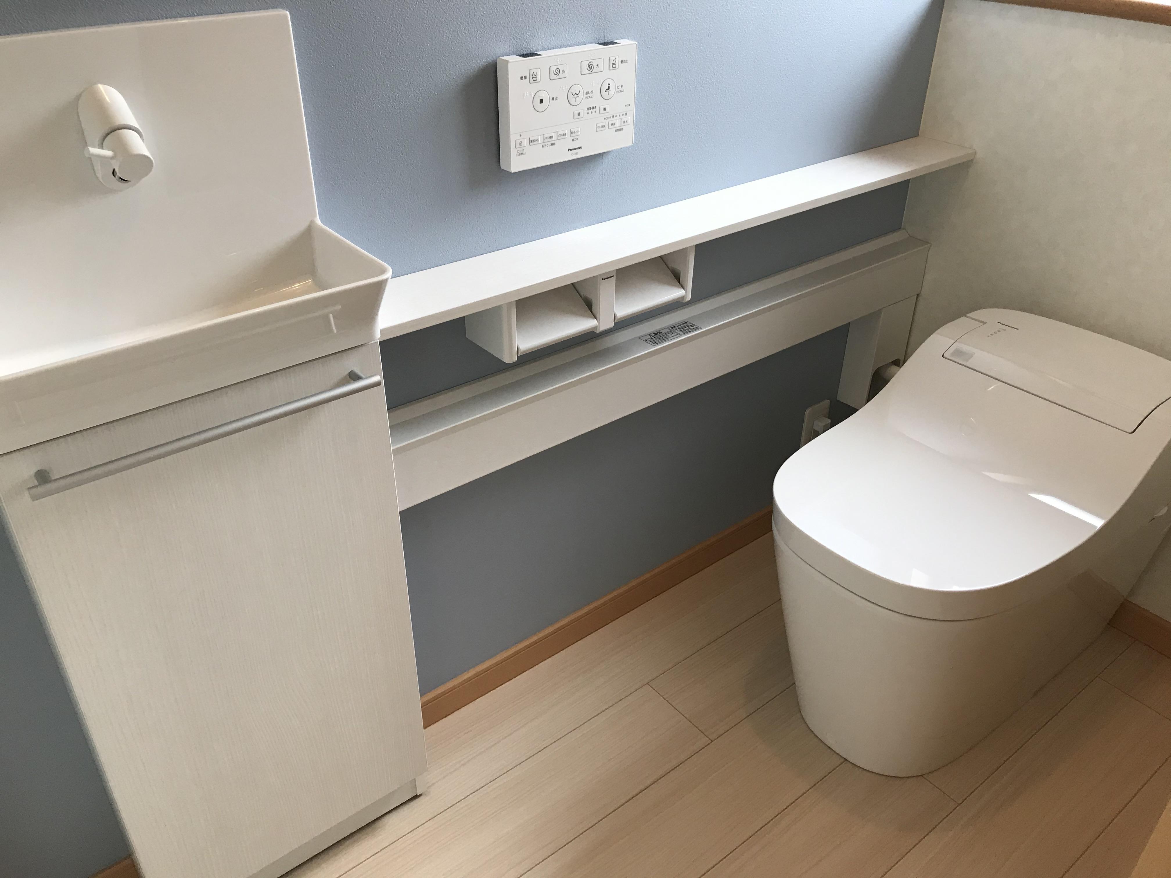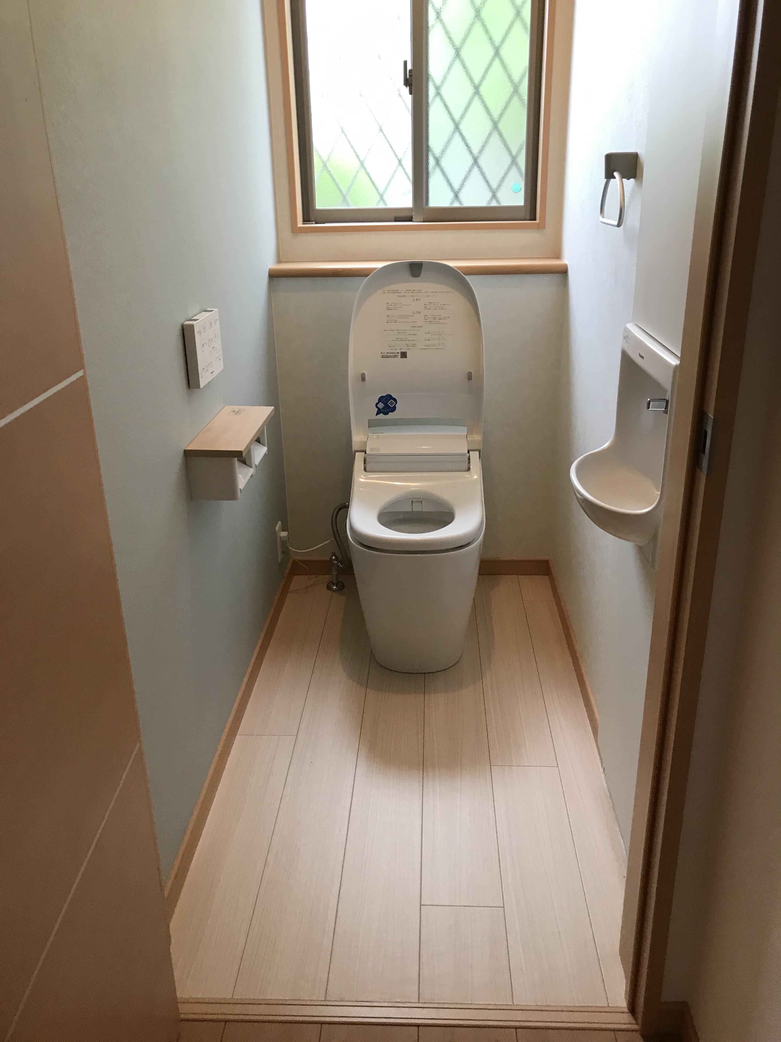 築浅の中古物件をご購入され、トイレ等の気になる部分をリフォームされました。 2階トイレはタンクレスにされ、リフォーム用手洗いも別途設置。 1階トイレもタンクレスにし、廊下のフローリングに近いクッションフロアの床に張り替えたことで、 トイレ内が広く感じるようになりました。リフォーム用手洗いは簡単な工事で設置可能なため採用されました。
