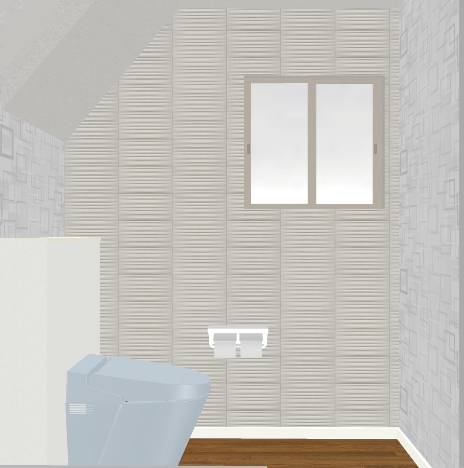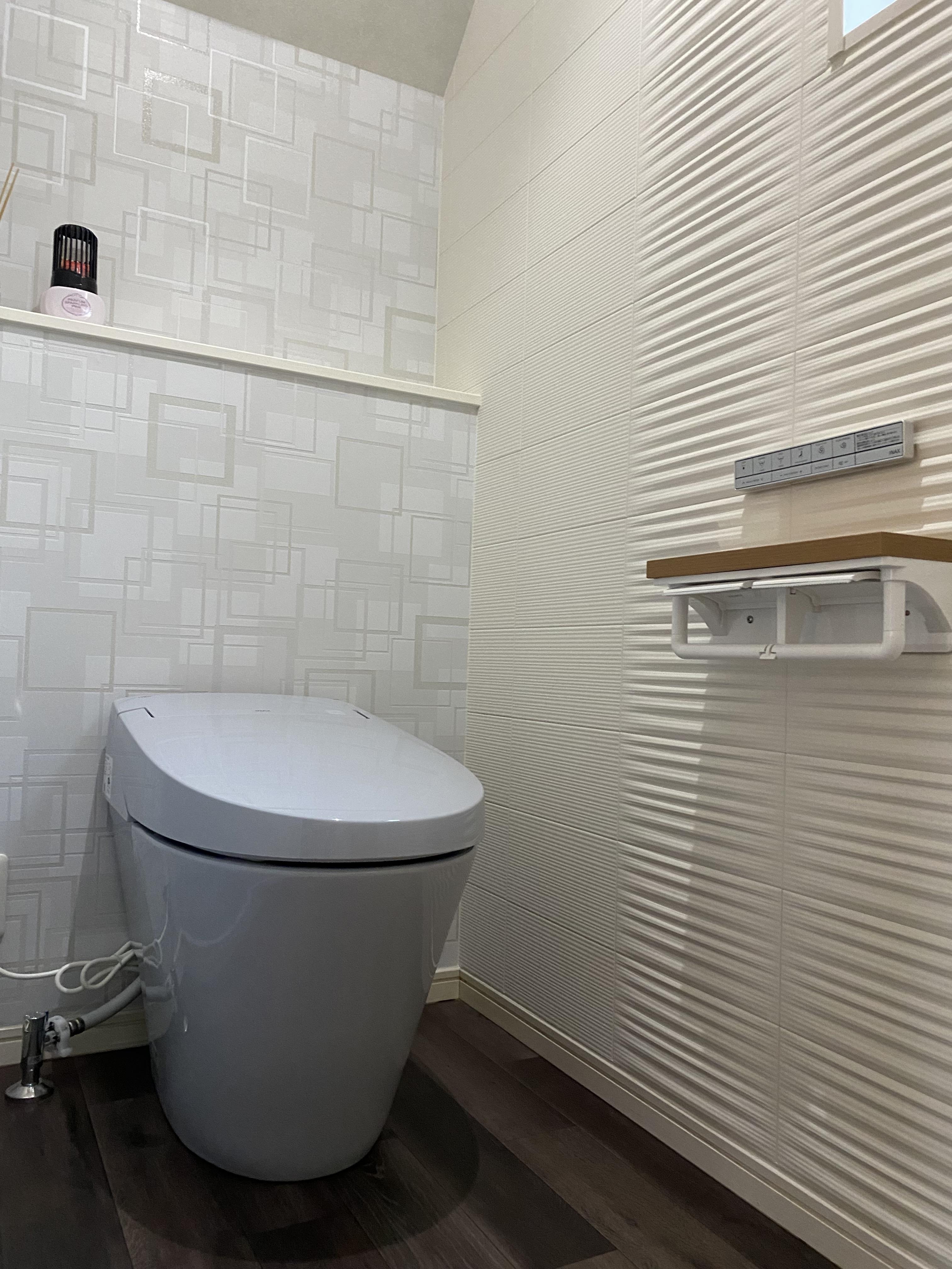 便器の故障をきっかけに1階トイレを改装。 調湿消臭機能を持った内装タイル、エコカラットを入口正面の壁全体に張りました。 トイレ:LIXIL サティスS カラー ブルーグレー エコカラット:LIXIL グラナスラシャ 床CFシート:サンゲツ HM-11052 壁クロス:サンゲツ FE76771 天井クロス:サンゲツ FE76023
