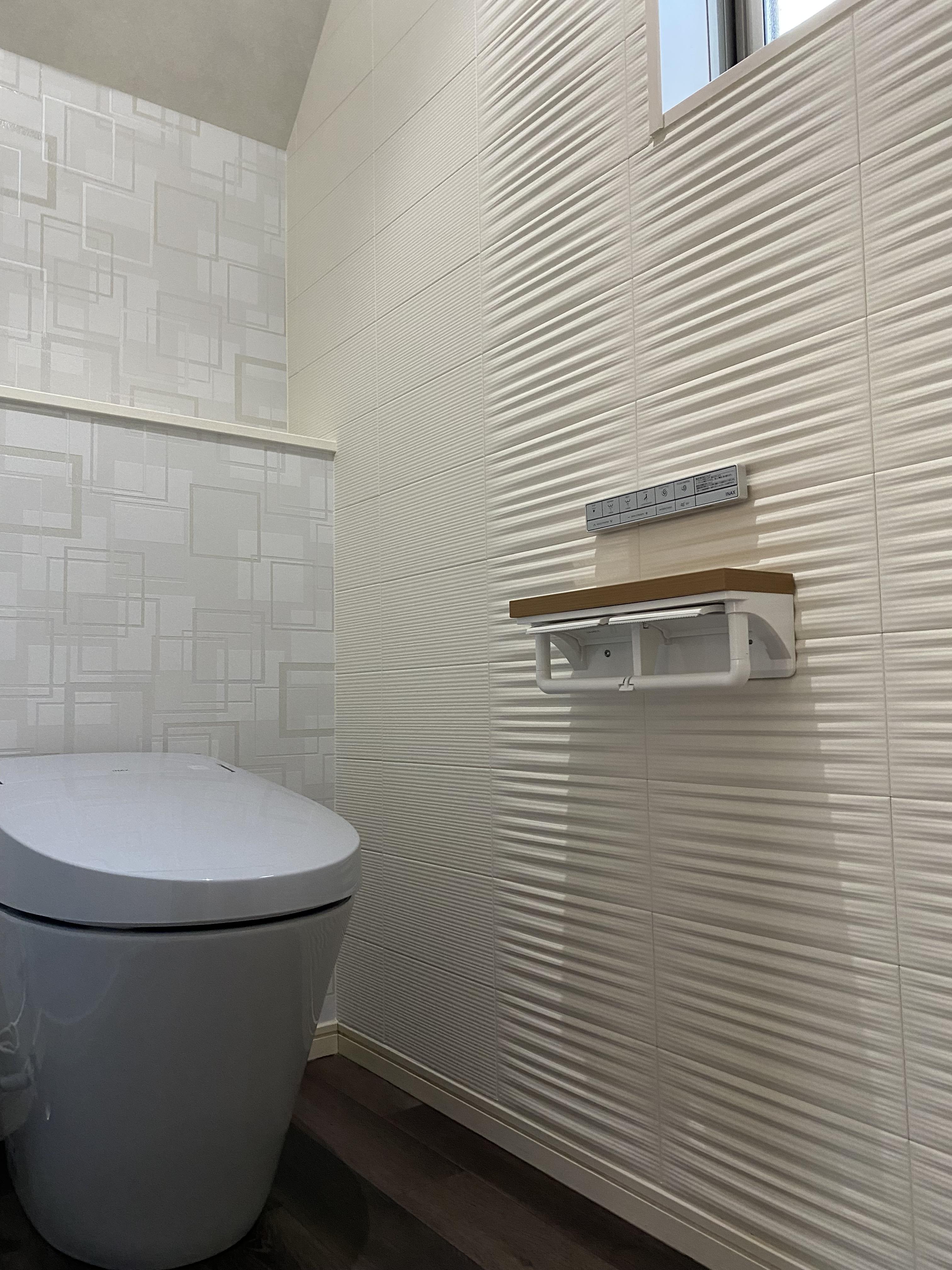 エコカラットもうまく納まり、便器カラーのブルーグレーが引き立っています。 素敵な空間に仕上がりました。