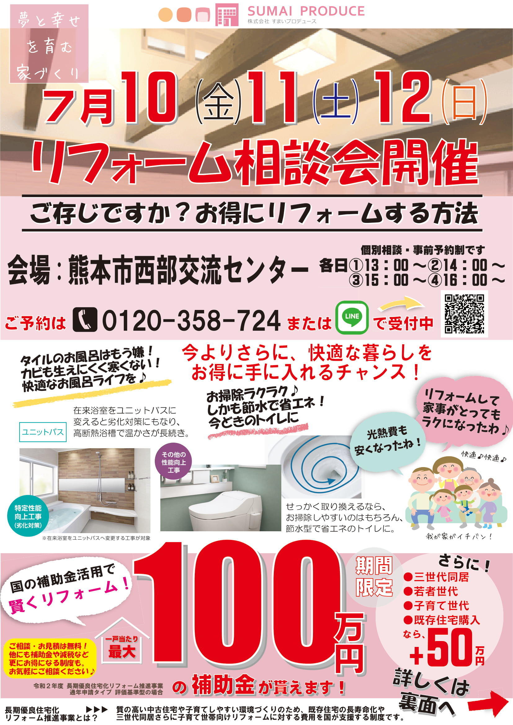 7月10日(金)11日(土)12日(日)、熊本市西部交流センターにて"リフォーム相談会"を開催いたします。