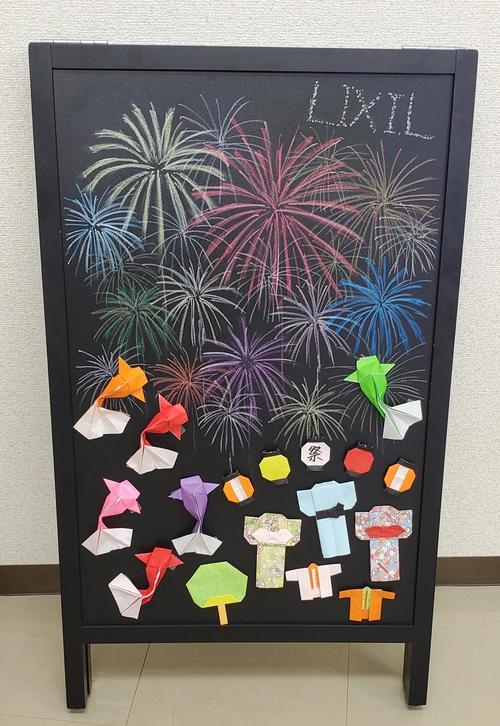 今までの夏編で折ってきた折り紙(浴衣・提灯・金魚・うちわ・はっぴ)と、