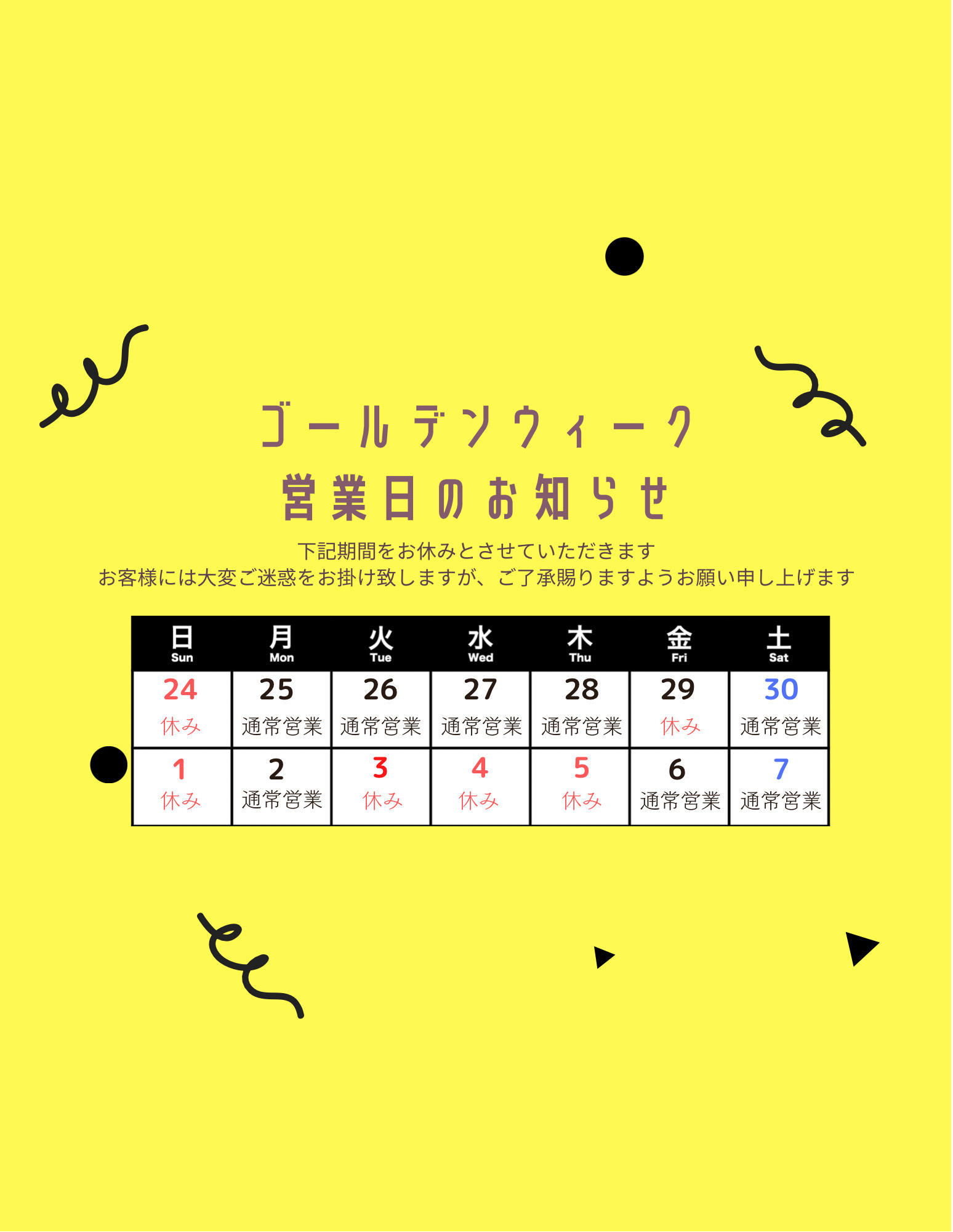 ゴールデンウィーク営業日のお知らせ
