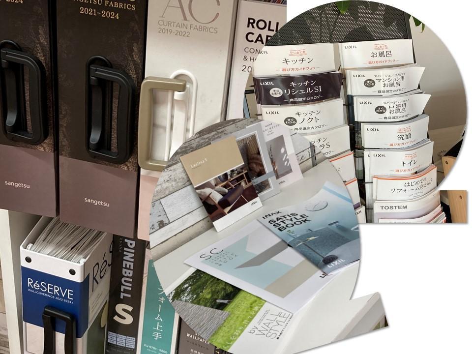 ショールームにはたくさんのカタログや、色見本素材見本などがあります。