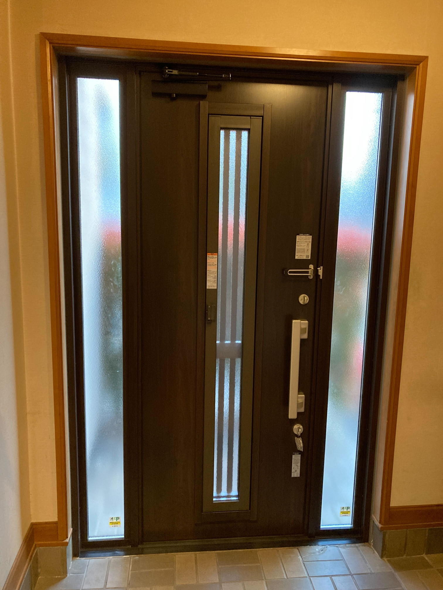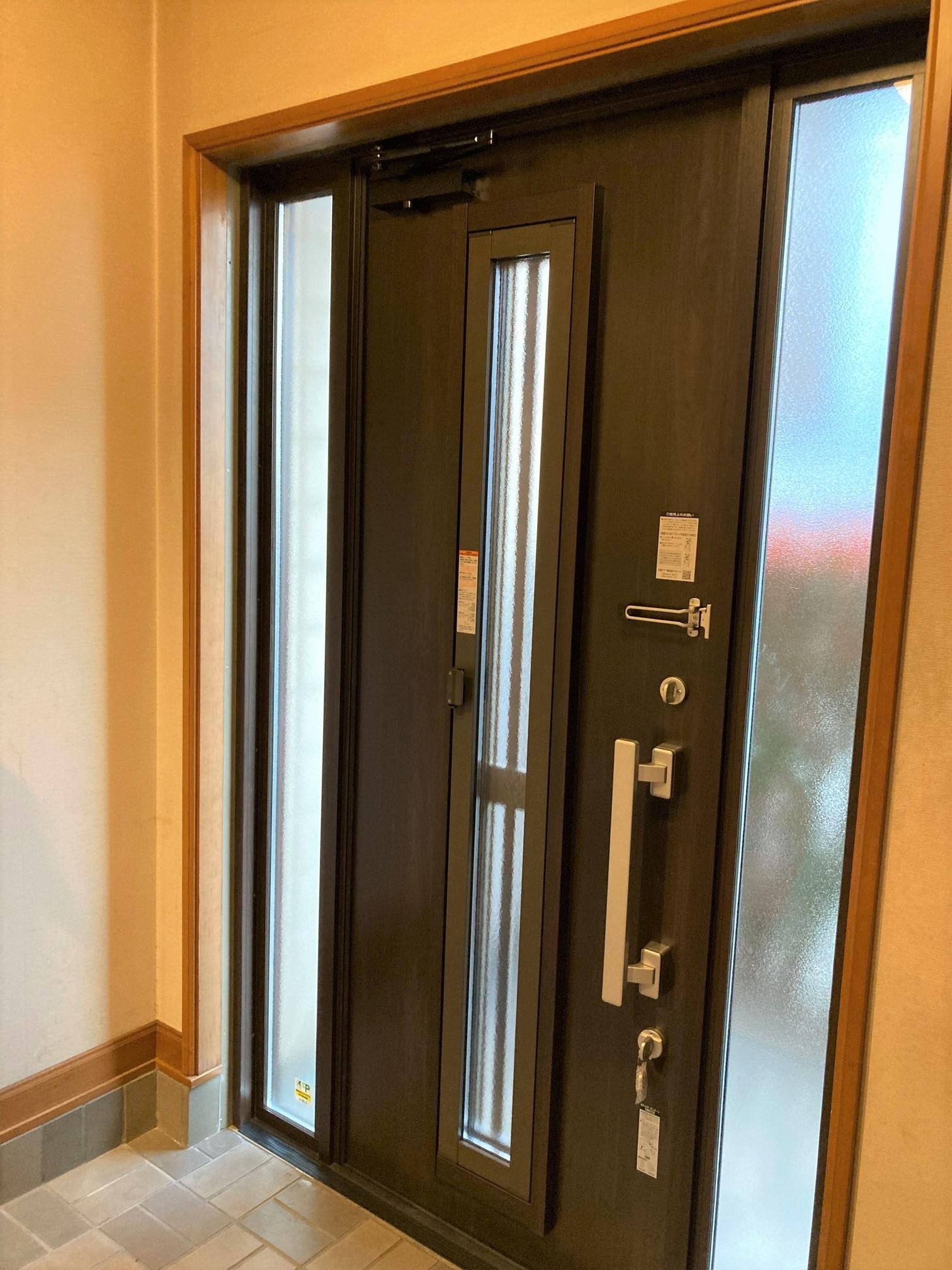 白っぽく色あせた玄関ドアを濃くのあるブラウン系のドアに替え重厚さが出ました。