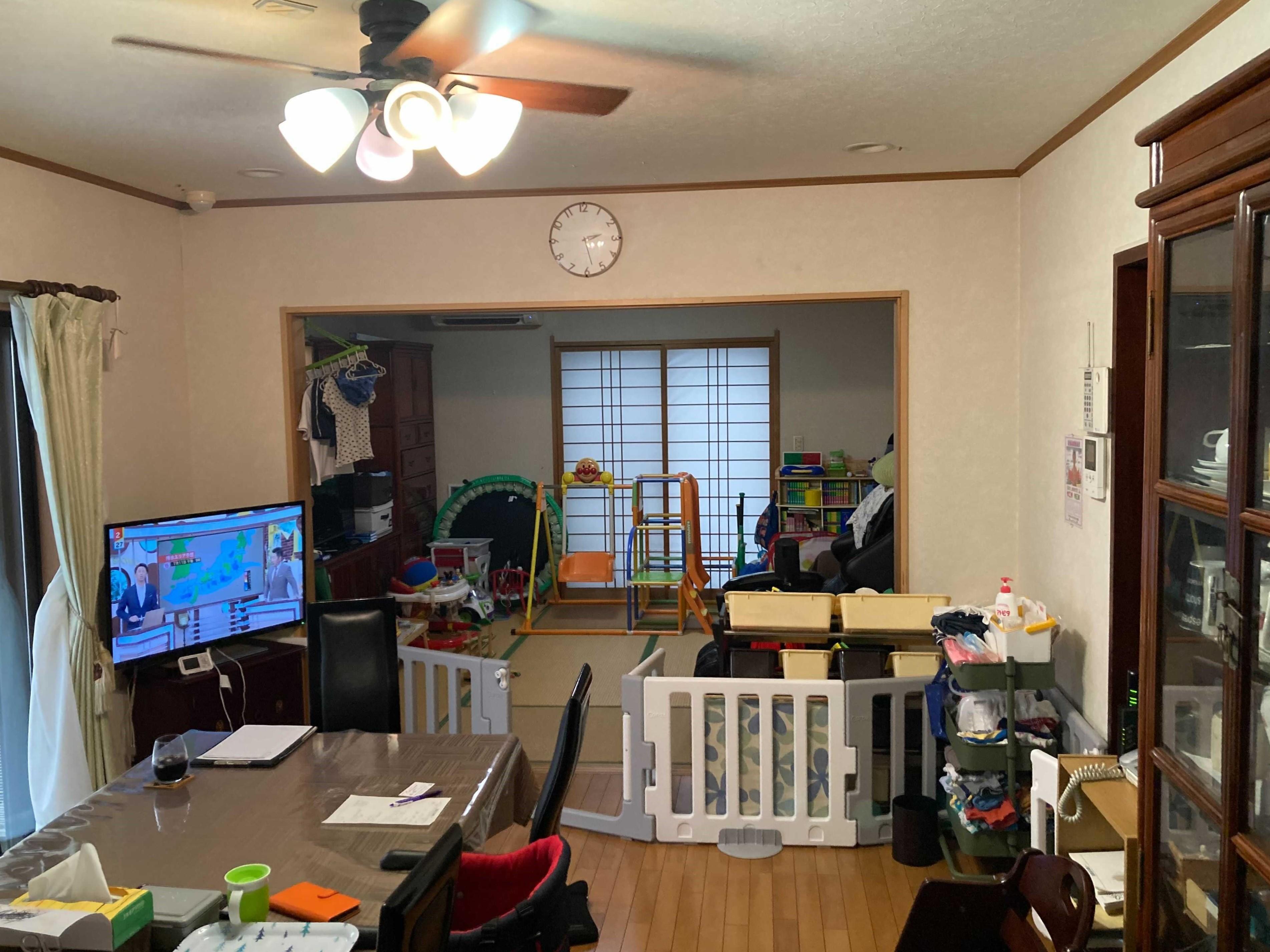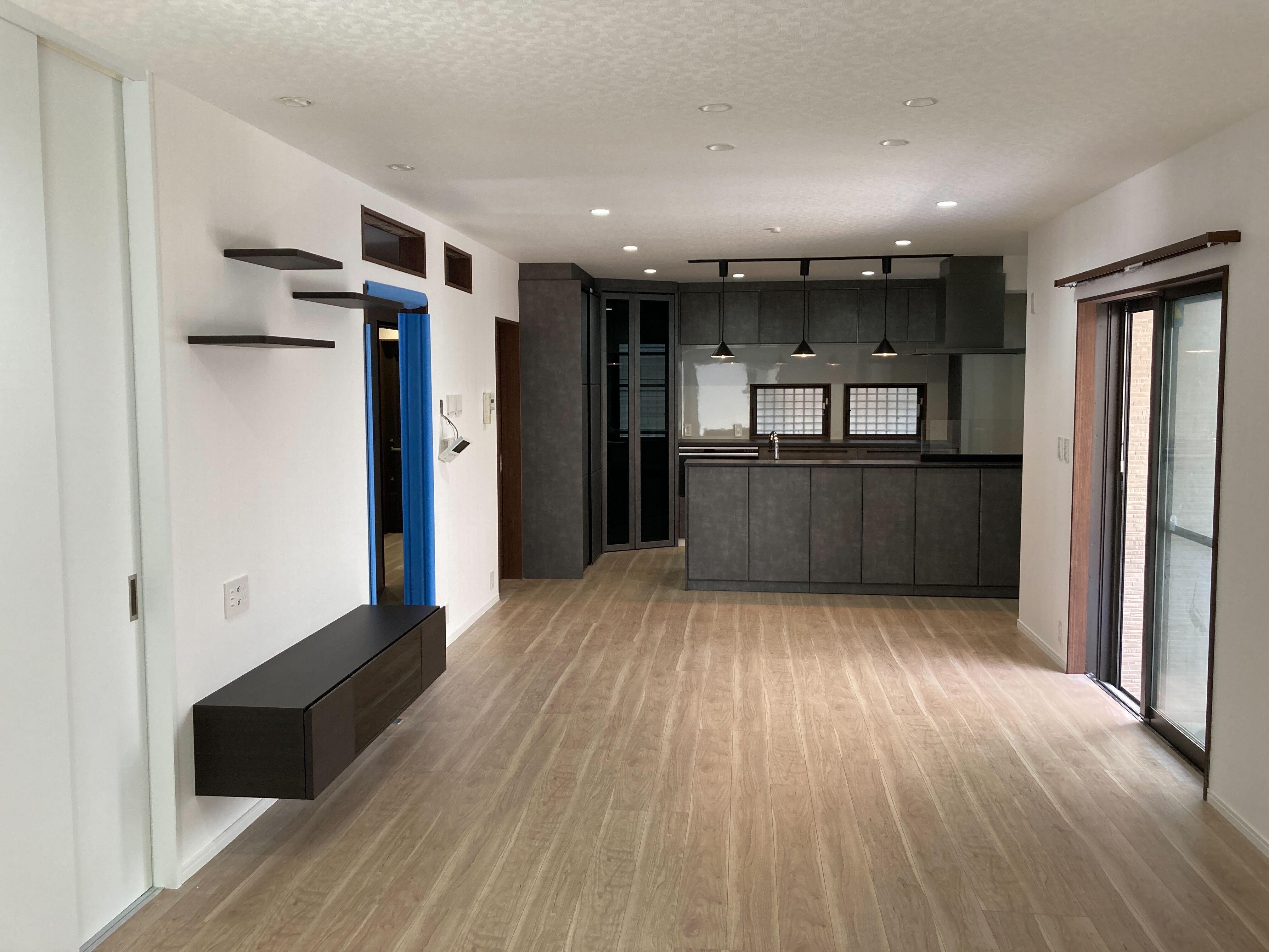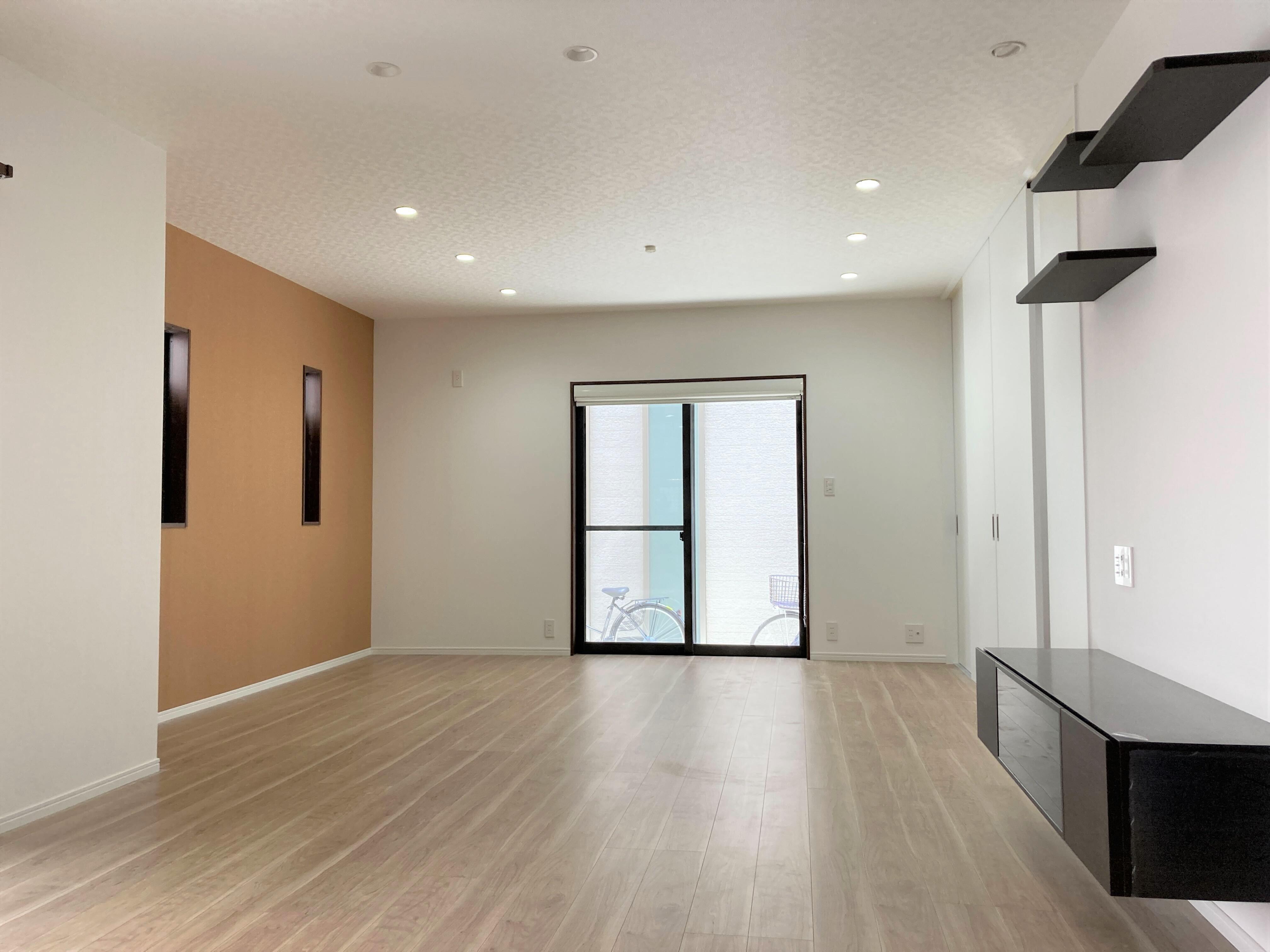 ダイニングから続くリビングは、和室との間の壁を取り払い、ガス温水式床暖房を備えたフローリングに。 片面の壁には、柔らかい質感で、弾力性・断熱性・防音性に優れたコルク材を採用しました。
