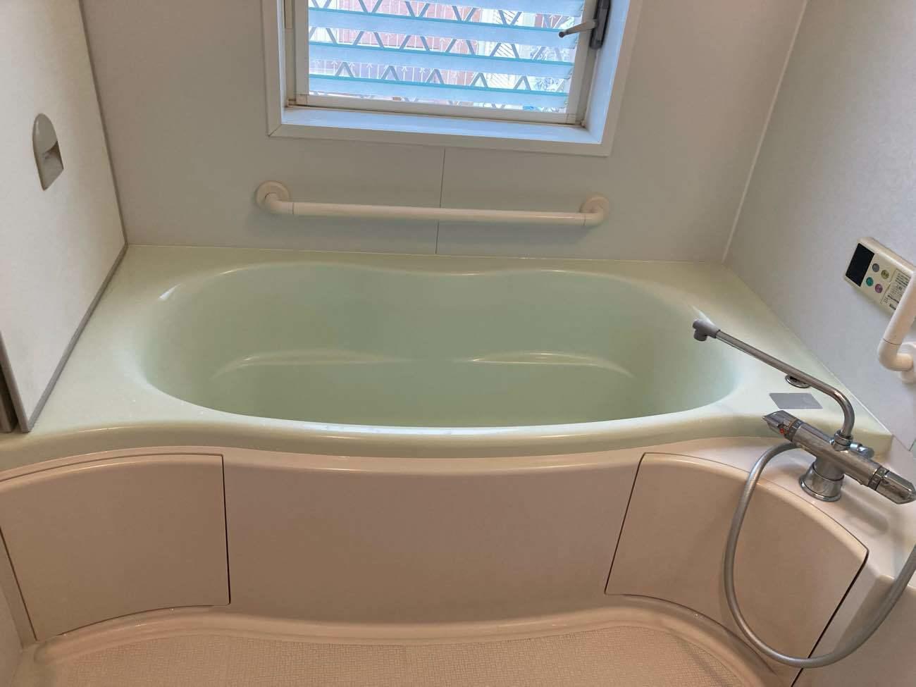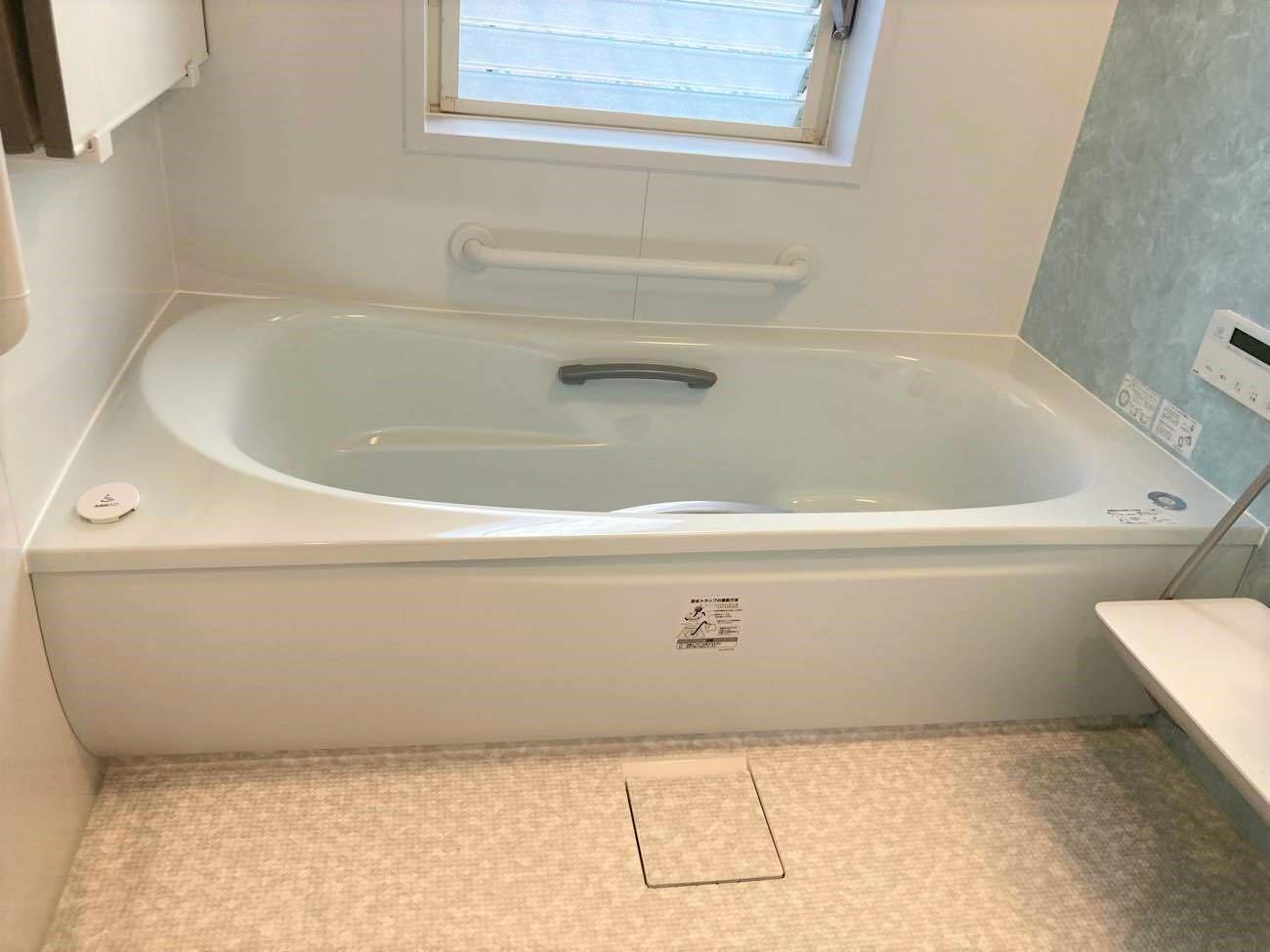 システムバス サザナHTシリーズ 腰掛けられる浴槽、出入りしやすい位置に手すり、段差をなくしこれからの入浴タイムが過ごしやすくなりました。
