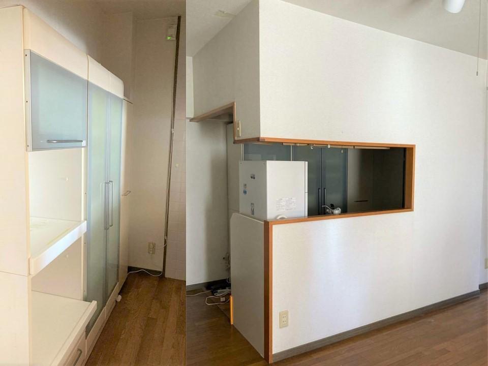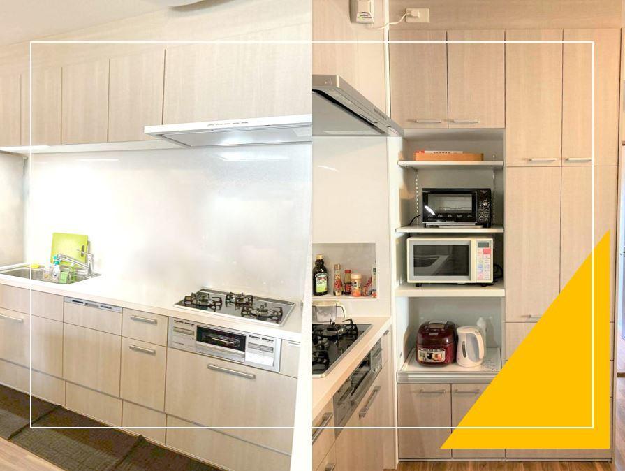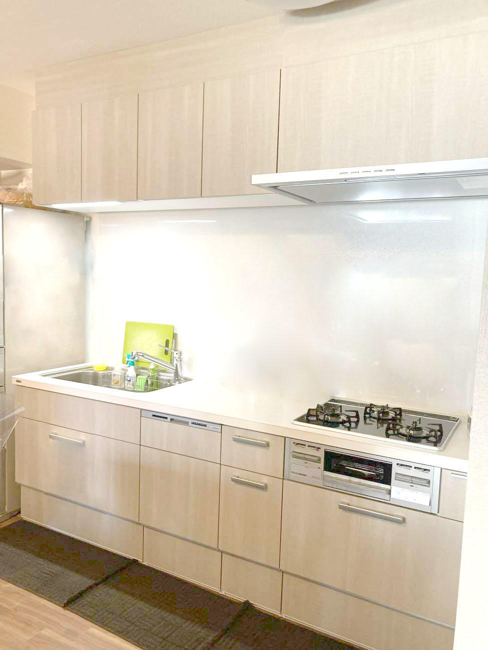 独立キッチンから壁を取り払い、壁付けキッチンへ。将来を考え壁際にキッチンを移動させ広々とした導線を確保。リビングとキッチン空間を繋げることで開放的な空間を作ることが出来ました。