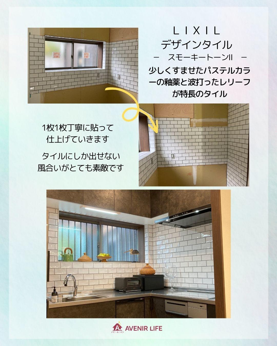 また、壁面にはお洒落なタイルを施工。職人さんの手によって1枚1枚貼られたタイルは耐久性が高く、油汚れも簡単に拭き取ることができます。