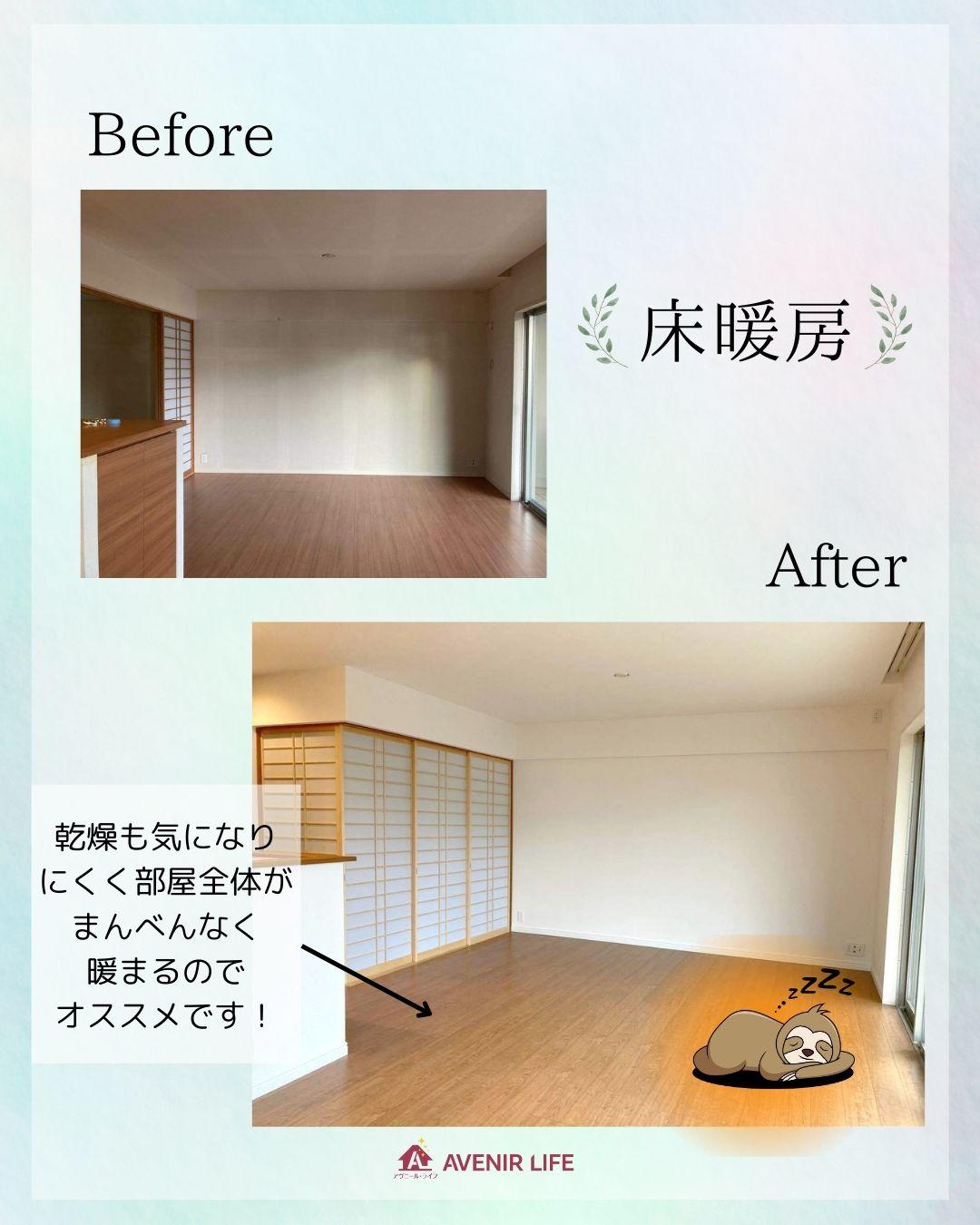 床暖房を設置。足元からじんわり暖めてくれる床暖房は、エアコンのように乾燥せず、部屋全体がまんべんなく暖まるのでオススメですよ♪