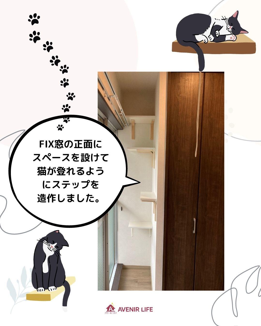 リビングには、FIXの窓の正面にスペースを設けて猫が登れるように造作しました!