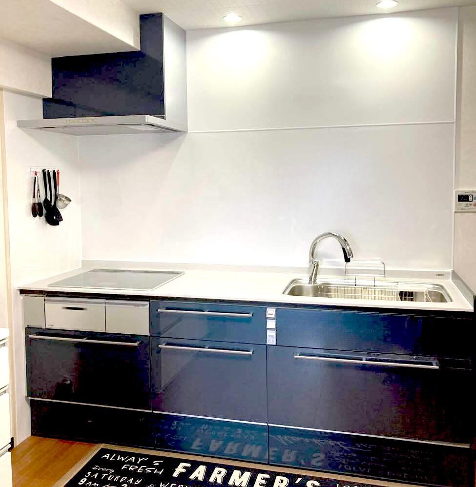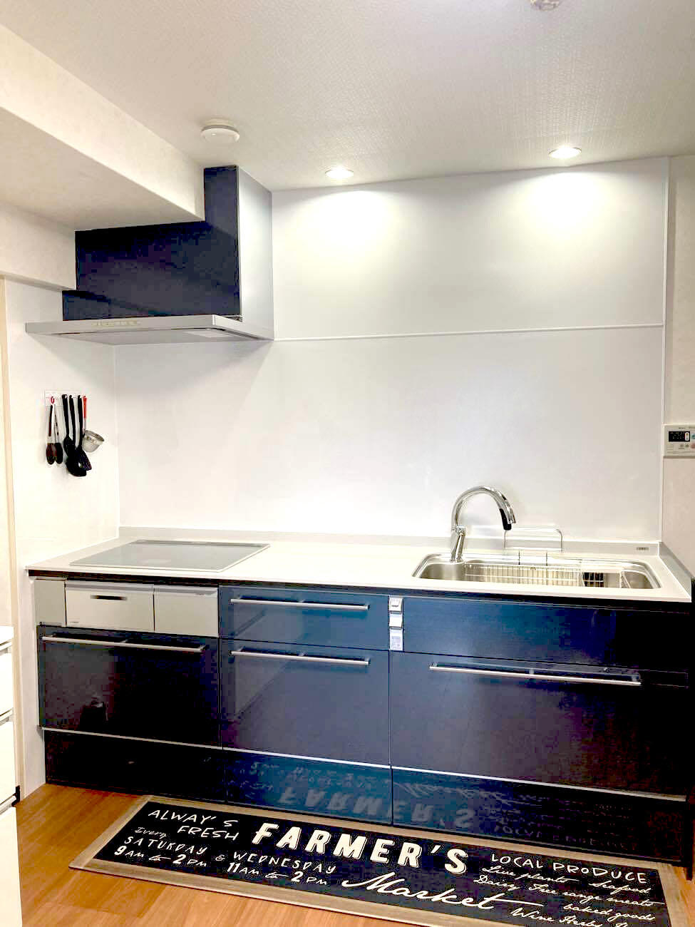 キッチンは吊戸棚を取り払ってダウンライトを設置し、スッキリと明るい空間に。
