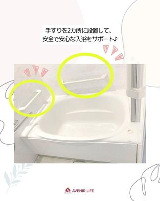 以前の浴室に比べ床も滑りにくくなり、ご高齢のお父様でも安心・安全に入浴できるよう、手すりを2カ所に設置させて頂きました。