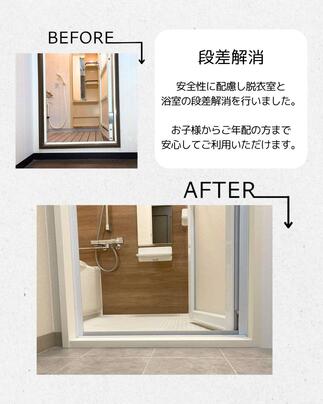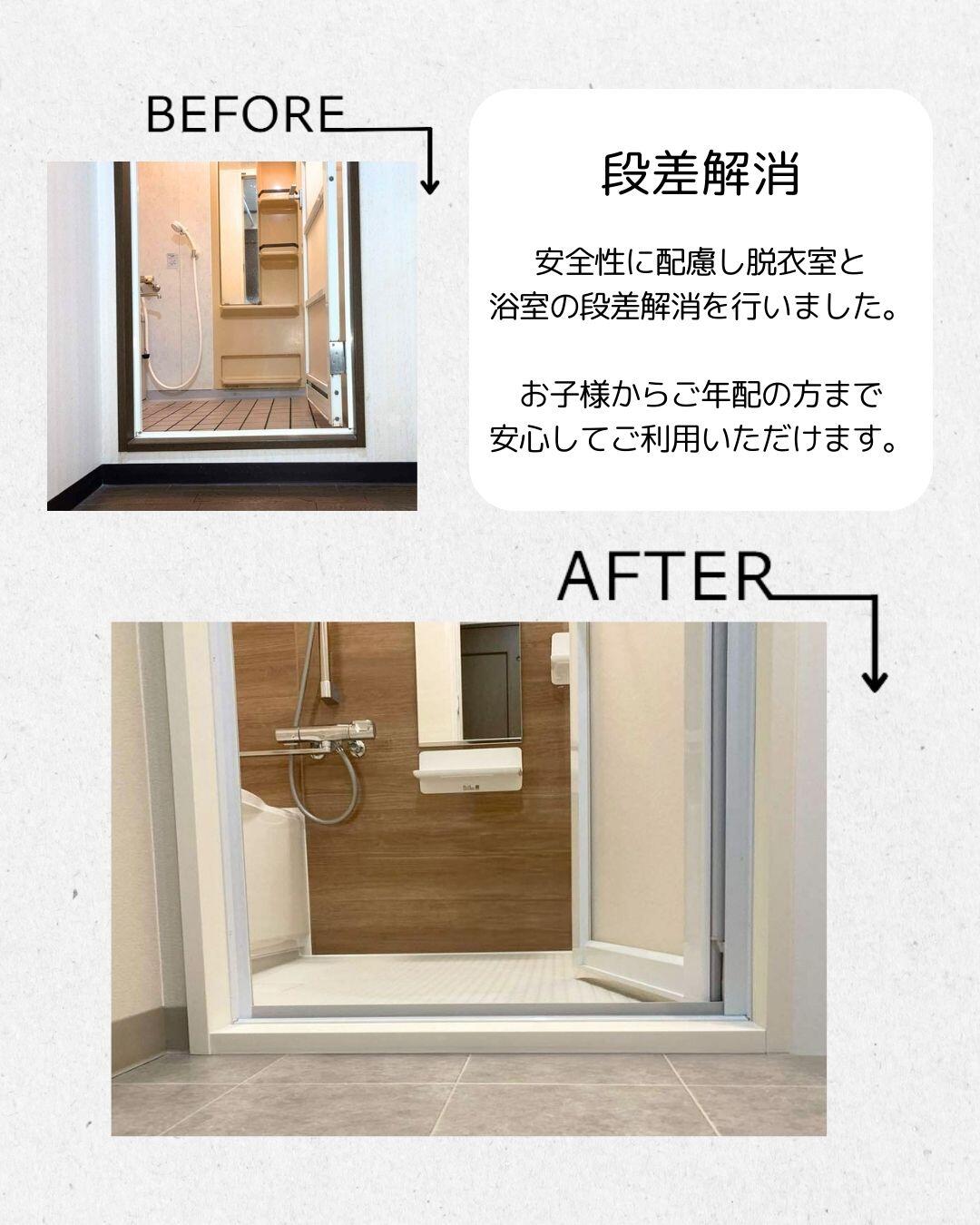 また、安全性に配慮し脱衣室と浴室の段差解消を行いました。お子様からご年配の方まで安心してご利用いただけます。