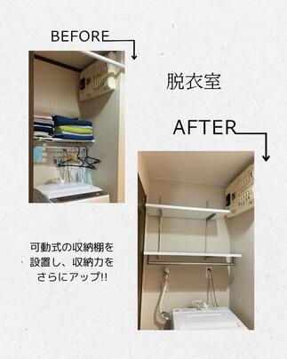 脱衣室の洗濯機上部には可動式の収納棚を設置し、収納力をさらにアップ。使いやすさを追求した収納空間になりました。