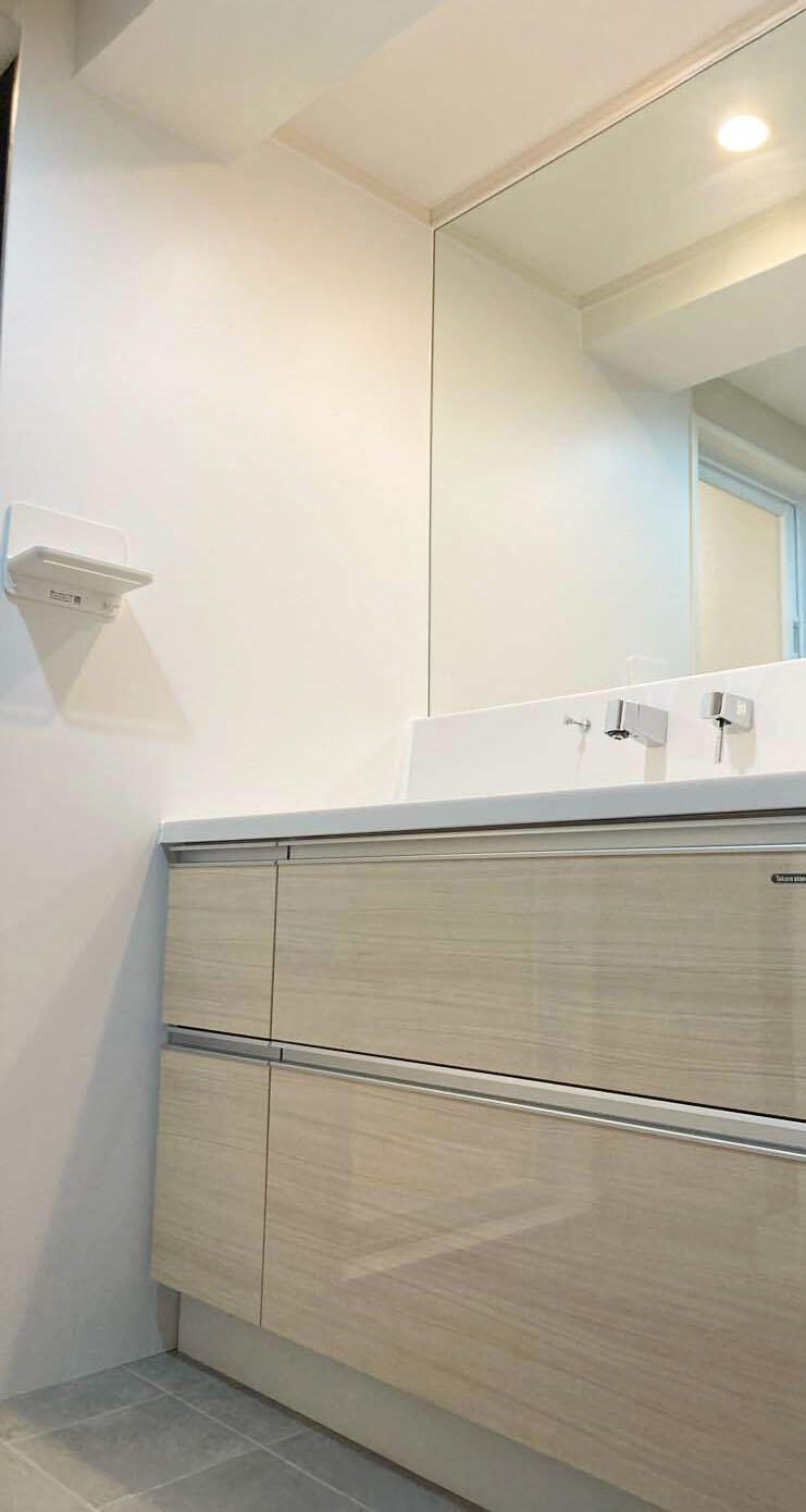 限られたスペースに対応したサイズバリエーションと、収納力抜群のキャビネットが特徴です。使いやすいデザインで、長く愛用できる洗面空間を提供しました。
