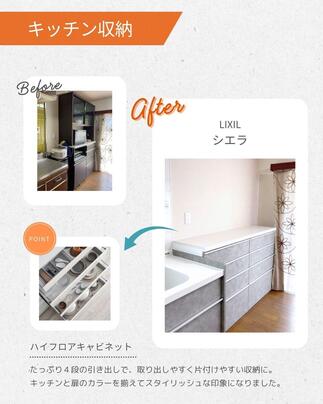 圧迫感のあった大きな食器棚を、カウンターのみのキャビネットに。たっぷり4段の引き出しで、取り出しやすく片付けやすい収納になりました。