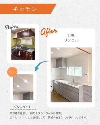 今回のリフォームにあたり、まずは吊戸棚を撤去。タイル貼りだった壁はキッチンパネルに、照明はダウンライトに換えて、広々とした明るい空間になりました。