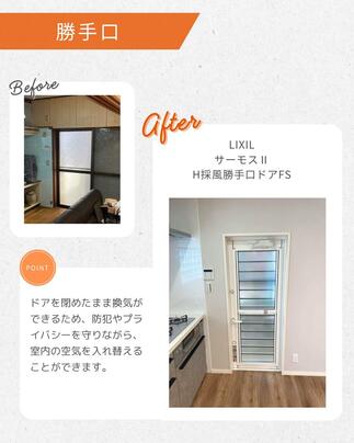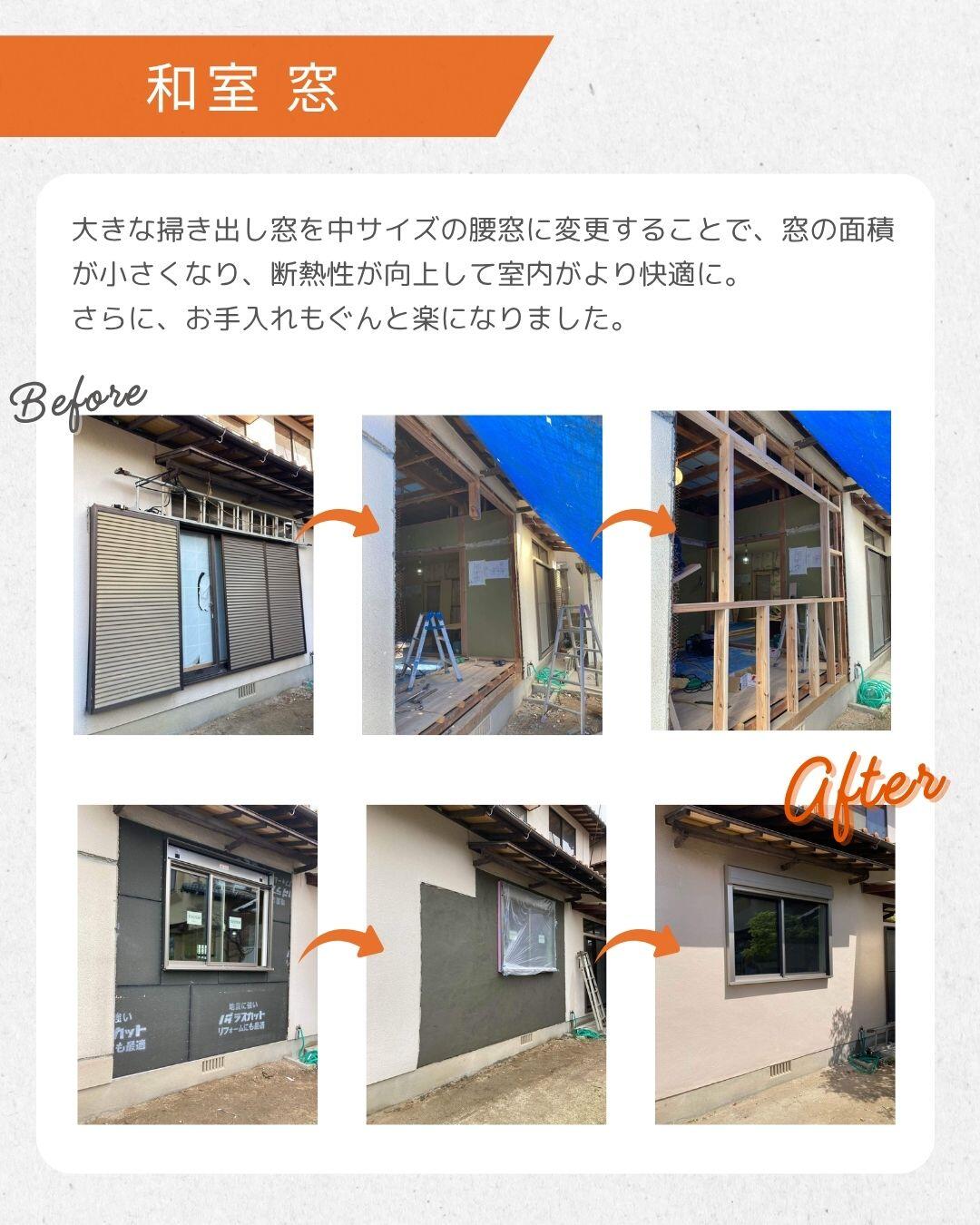光はたっぷり入る反面、夏は暑く冬は寒い昔ながらの大きな窓を、小さめの窓や勝手口に変更し、しっかり断熱性を向上。