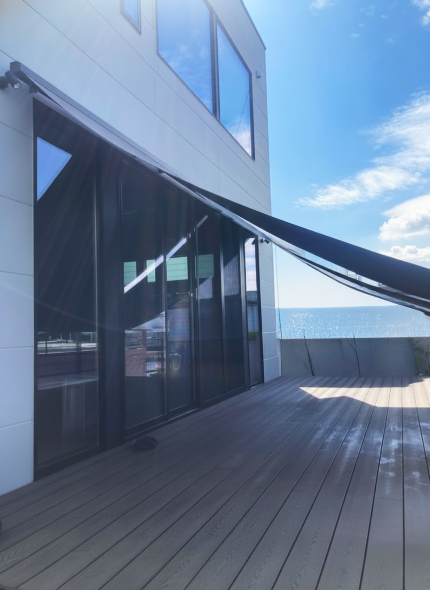 福岡市K様邸では、LIXILの「スタイルシェード」を使った外構リフォームを実施。ウッドデッキに日差し対策を加え、太陽の熱を窓の外側でカット!1日で工事が完了するおすすめリフォームです。
