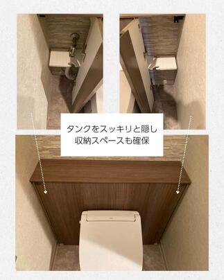 ✓タンクをすっきり隠して、見た目がスマートに! ✓ キャビネット付きで収納スペースも確保。 ✓ 壁面は石目調クロスでホテルライクな落ち着き空間に♪