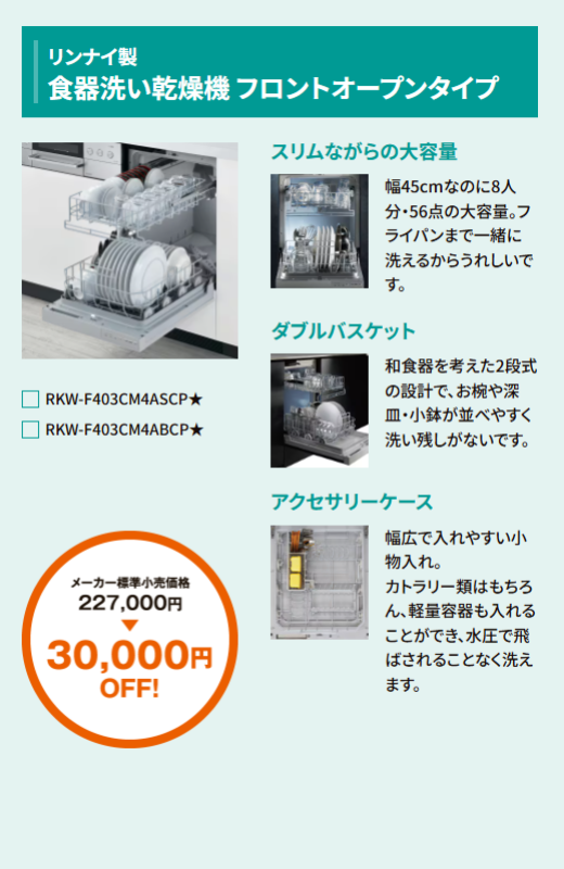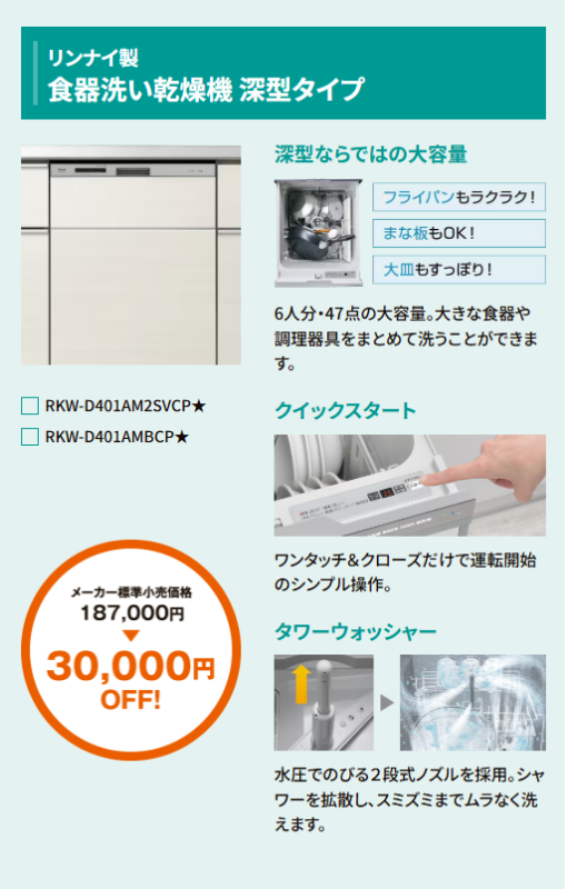 | 対象食器洗い乾燥機 | リンナイ製 食器洗い乾燥機 深型タイプ (RKW-D401AM2SVCP★, RKW-D401AMBCP★) リンナイ製 食器洗い乾燥機 フロントオープンタイプ (RKW-F403CM4ASCP★, RKW-F403CM4ABCP★) |