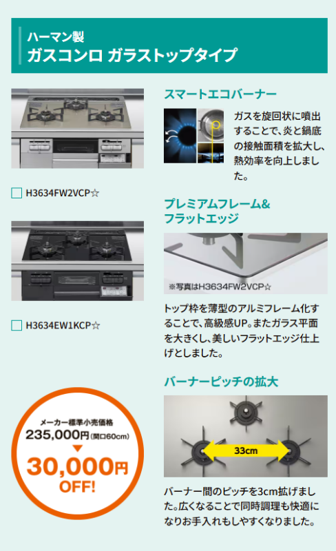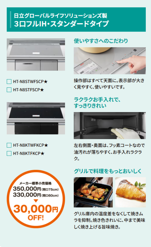 | 対象加熱機器 | 日立グローバルライフソリューションズ製 3口フルIH・スタンダードタイプ (HT-N8STWFSCP★, HT-N8STFSCP★, HT-N8KTWFKCP★, HT-N8KTFKCP★) ハーマン製 ガスコンロ ガラストップタイプ (H3634FW2VCP☆, H3634EW1KCP☆) |