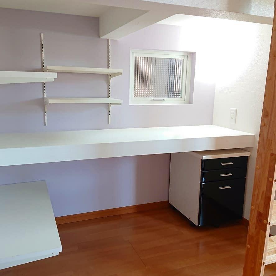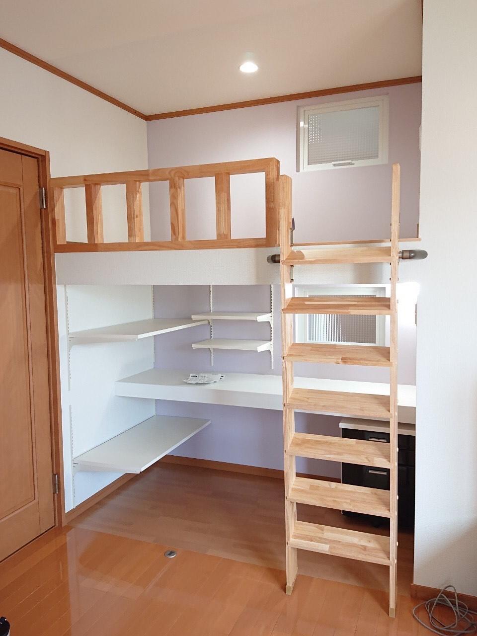 住まう家族構成が変わり、寝室のクローゼットをお子様のスペースにリフォームしました。来年から小学生になるお子様のために勉強コーナーを作り、その上にはロフトベットを設置しました。クローゼットはお隣の部屋のスペースを取り込み、新たにウォークインクローゼットを設置しました。