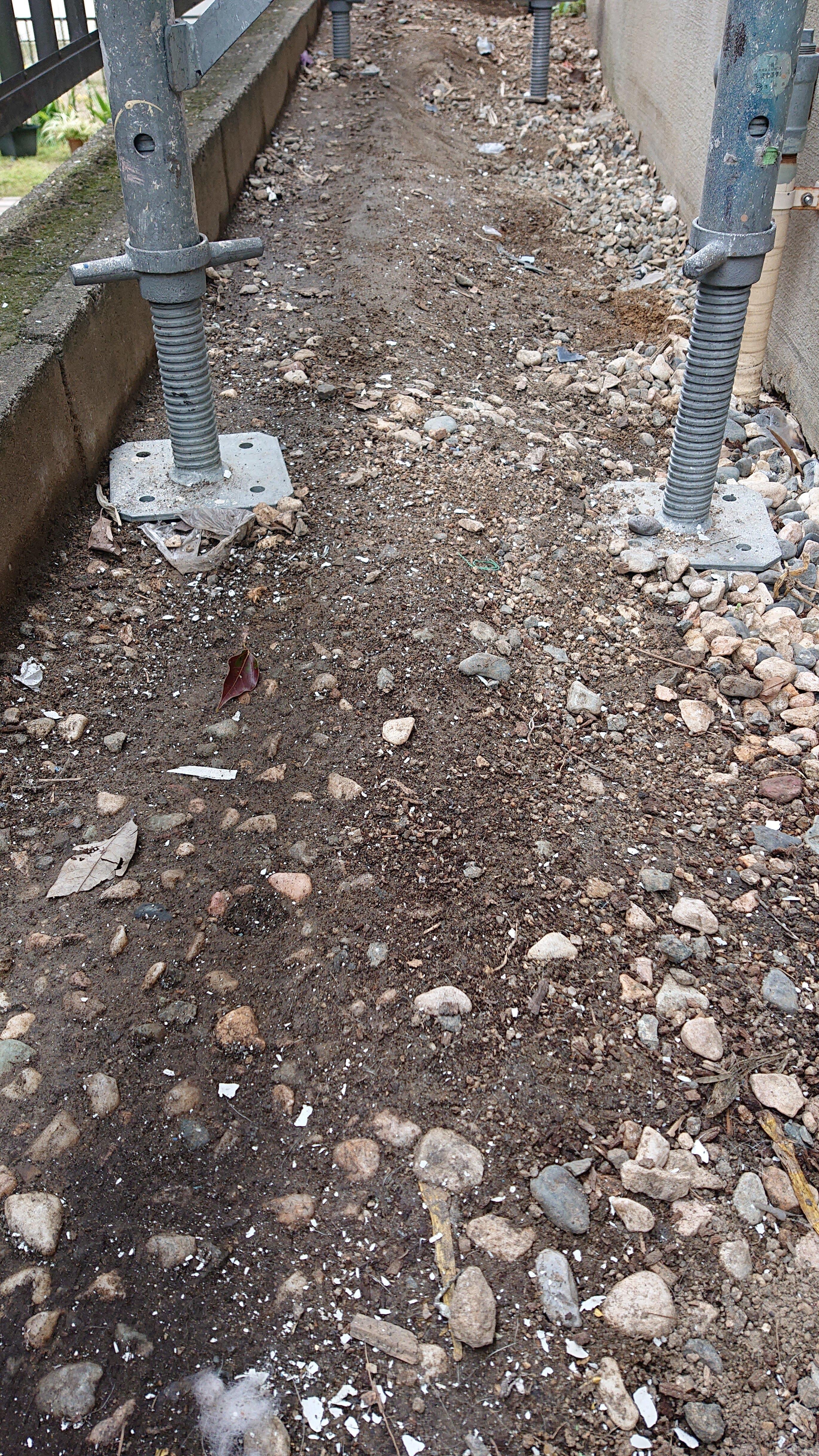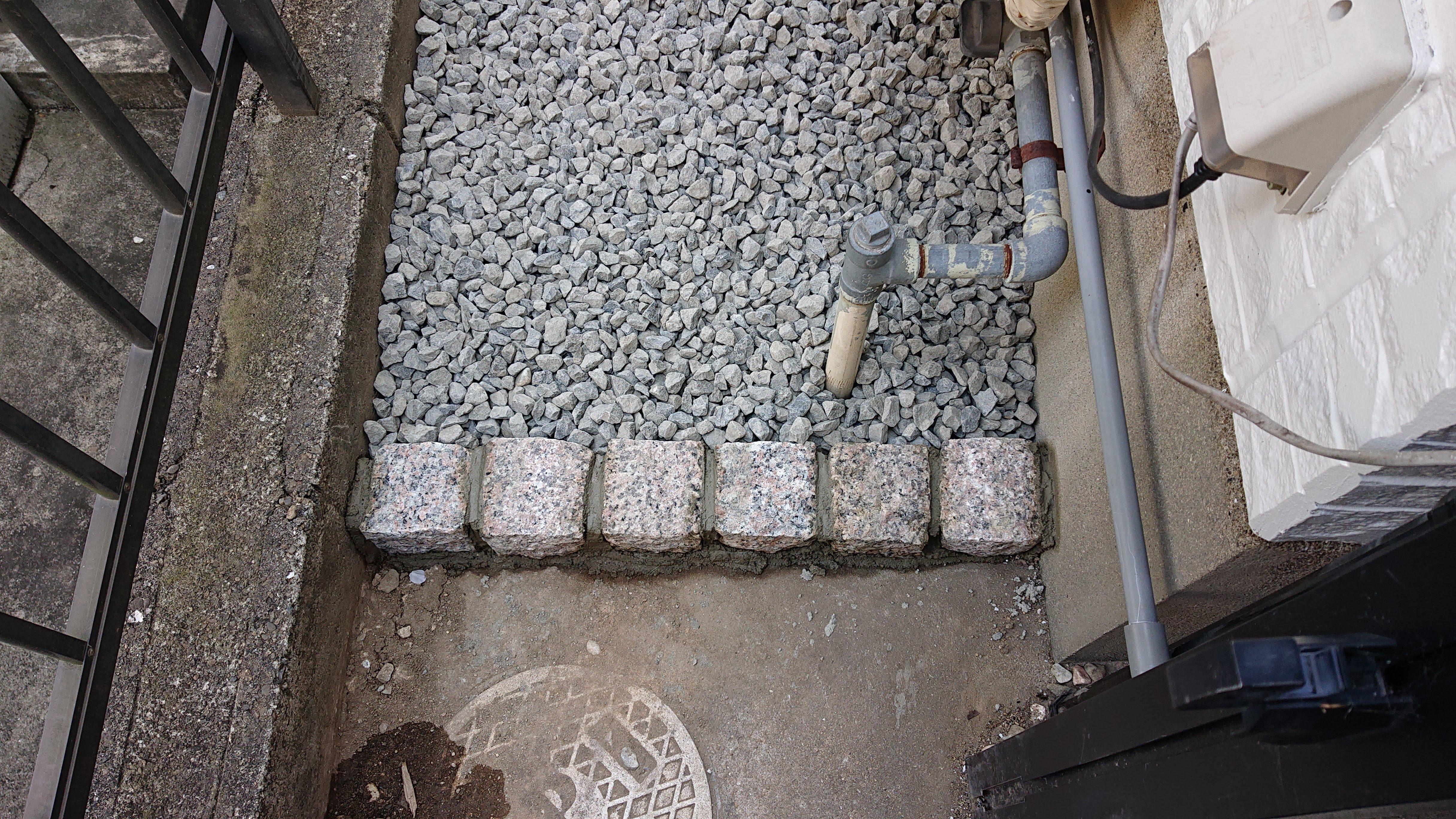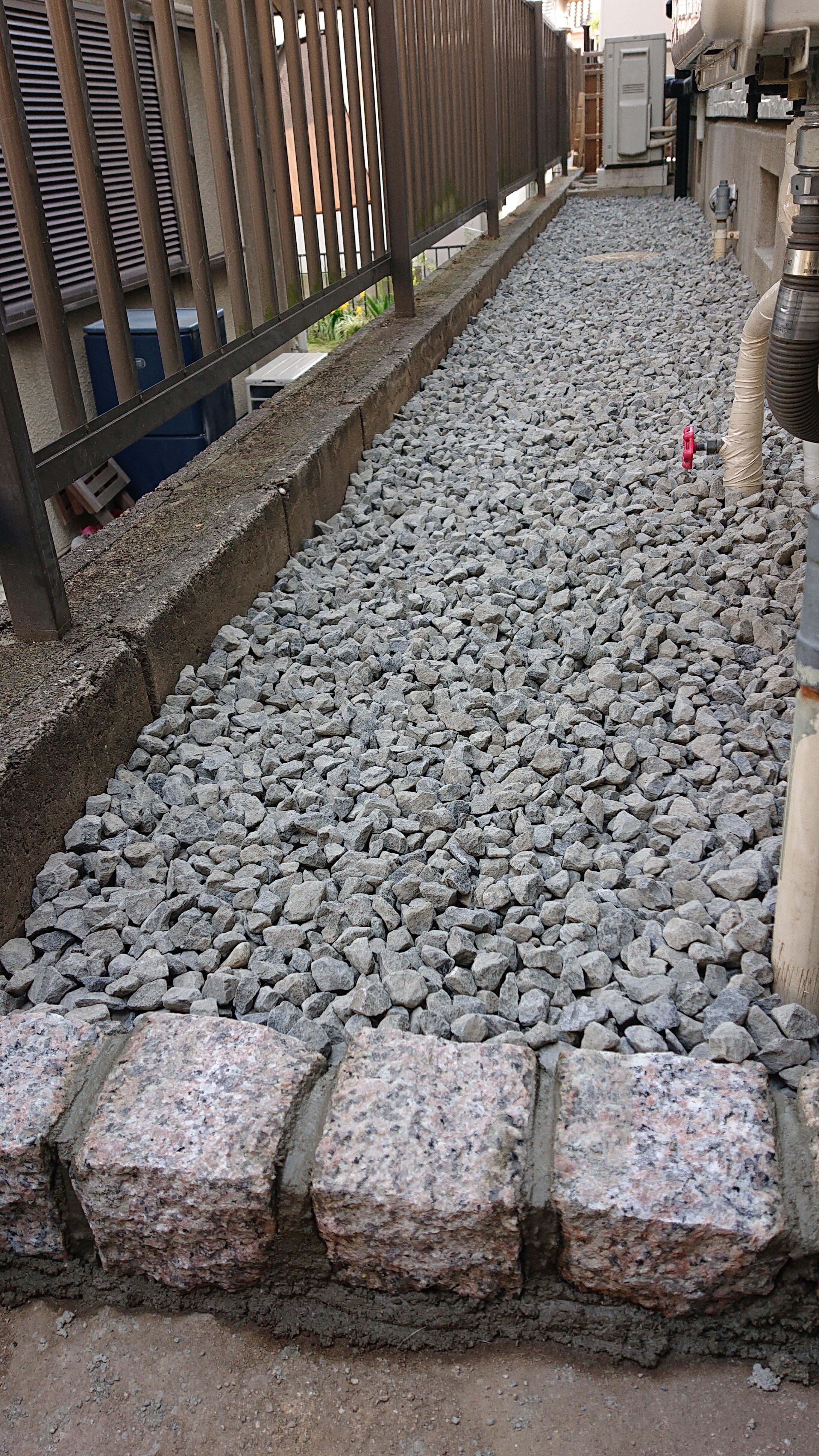さらに、敷地の東側通路が、 雨が降る度に通りづらかったので、 防犯に効果があり、 お財布にも優しい、 砕石敷きに。 石が逃げないよう、ピンコロ石で止めました。 排水の会所の蓋の高さも上げて、 点検やお掃除もしやすくなりました。