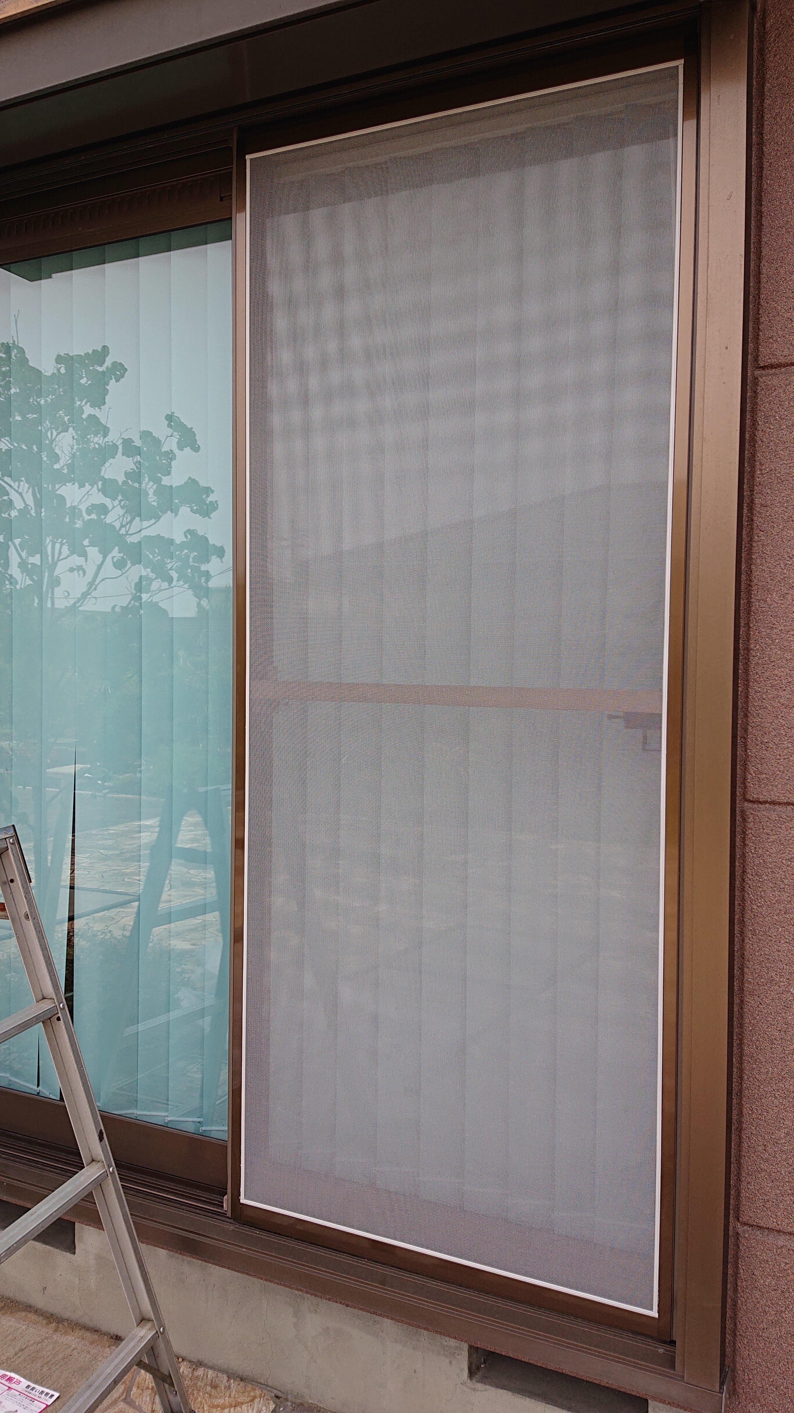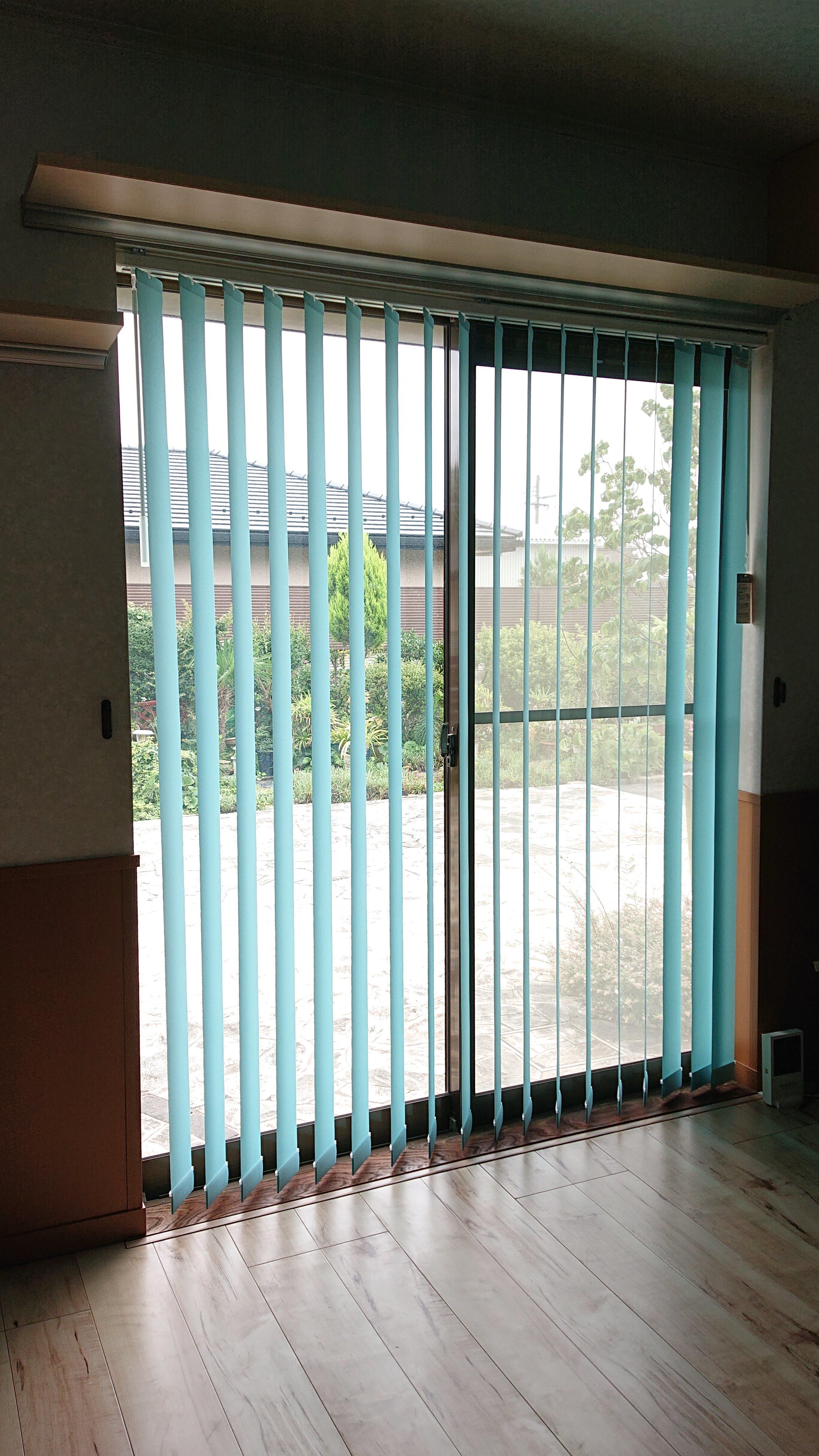 掃き出し窓まわりにキャットウォークを設置、カーテンは撤去してバーチカルブラインドに替えました。網戸もペット用網戸に交換しました。