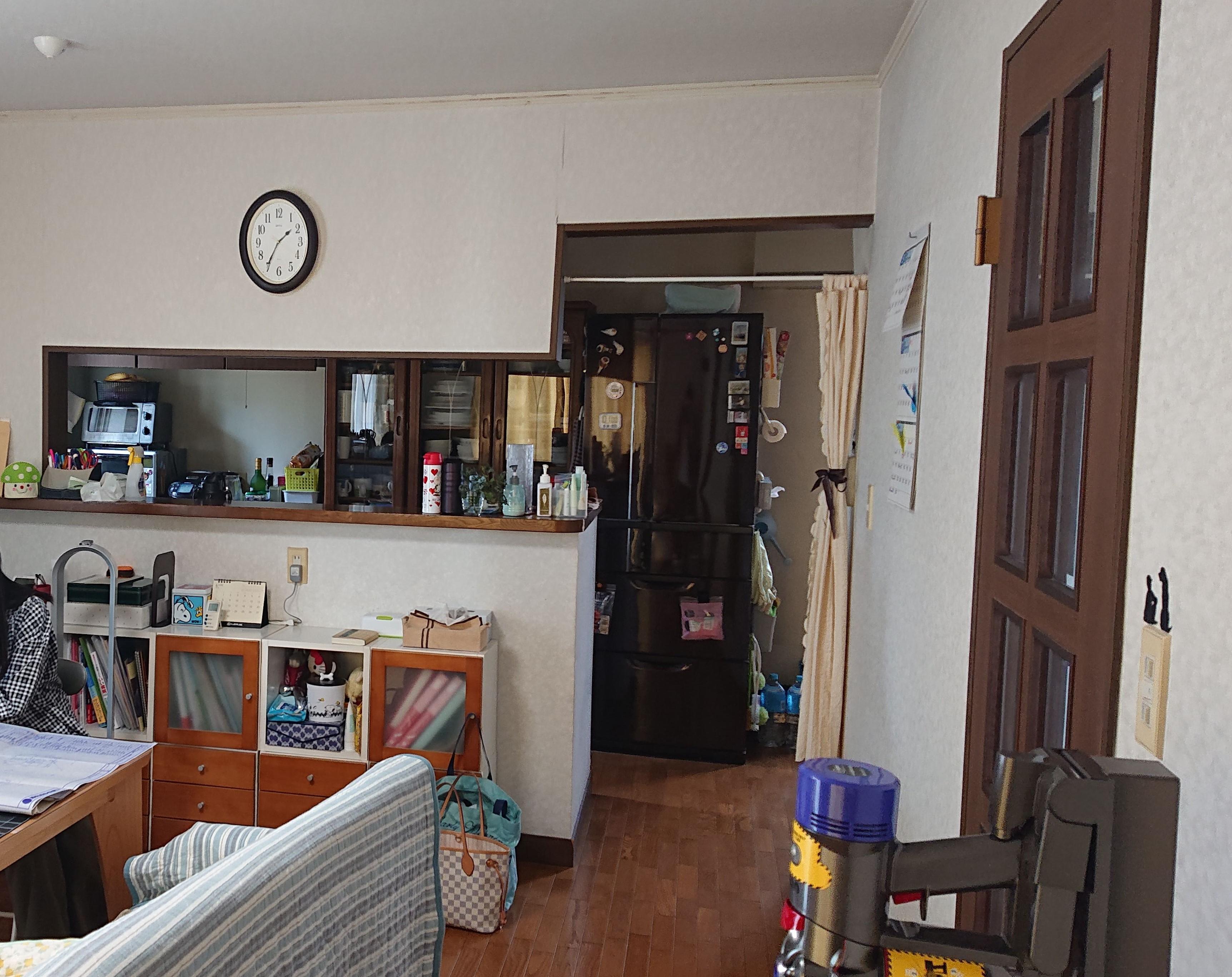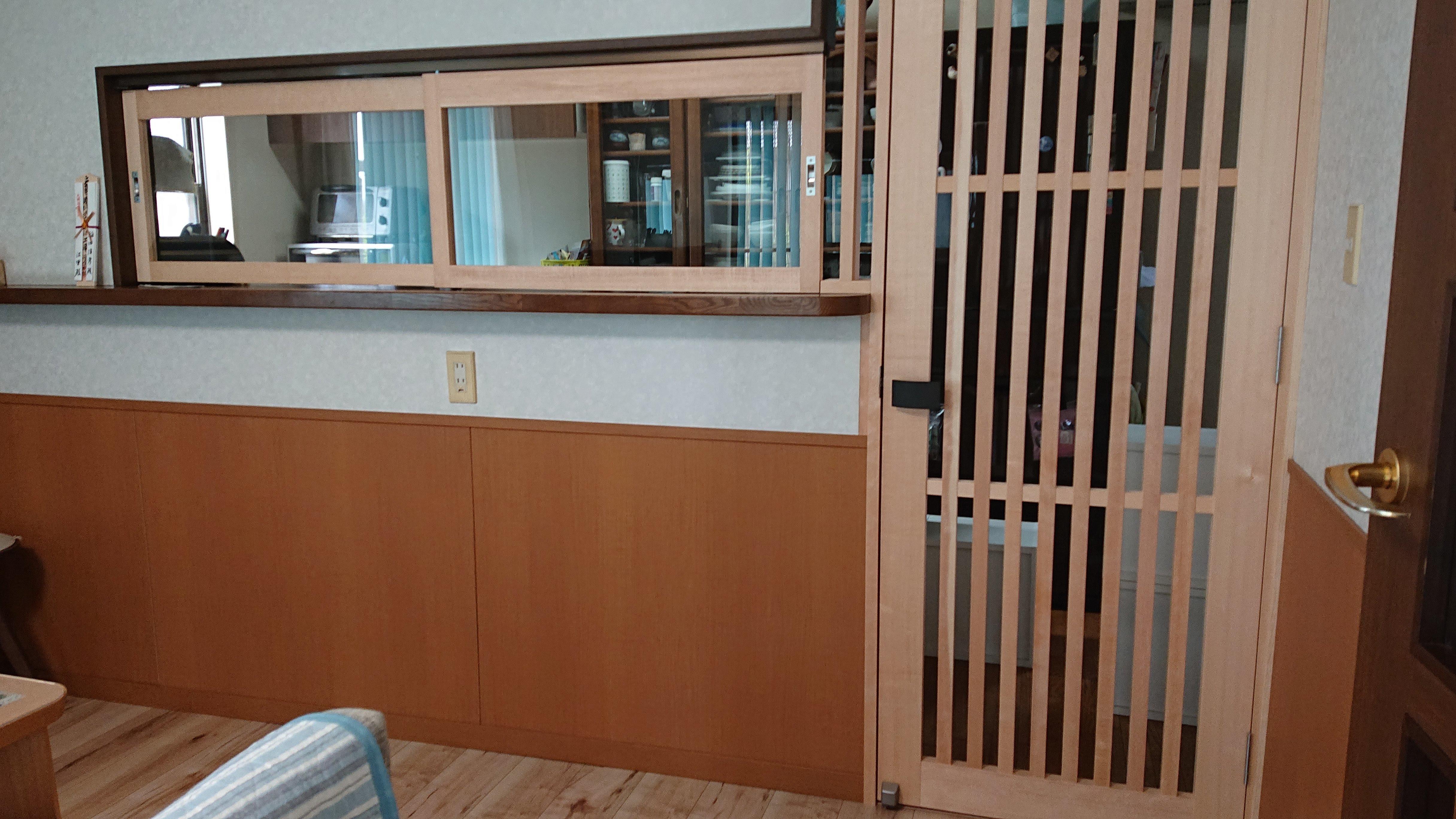 キッチンには侵入できないように、ダイニングとの間に縦格子のドアを設置、対面カウンターには引違ガラス戸を設置しました。