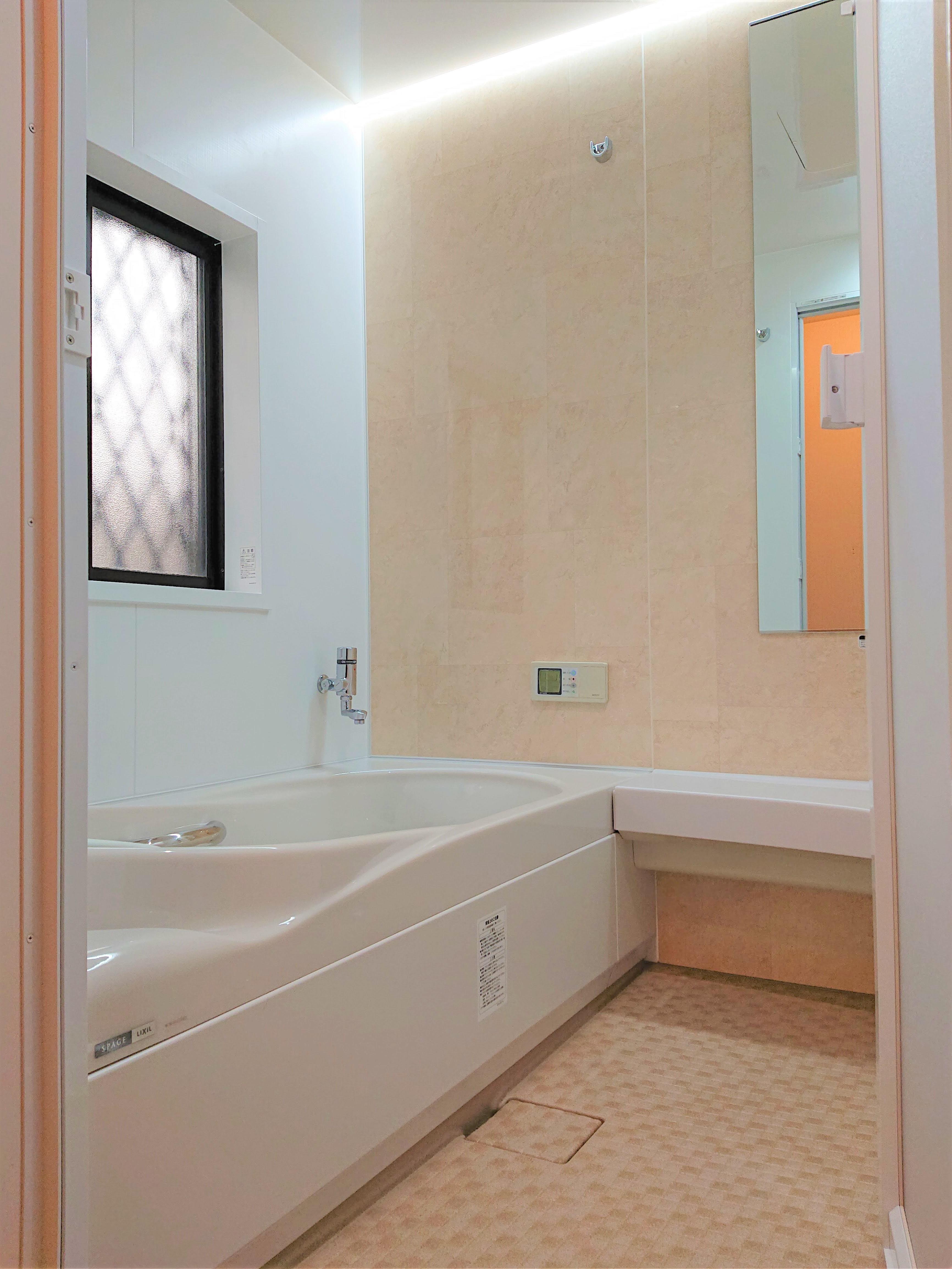 浴室をLIXILの最上位グレードのシステムバス【スパージュ】にリフォームしました。浴槽が以前より大きくなって、ゆったり寛げます。ジェットバス、ライン照明を採用して、まるでスパのような極上バスルームになりました。