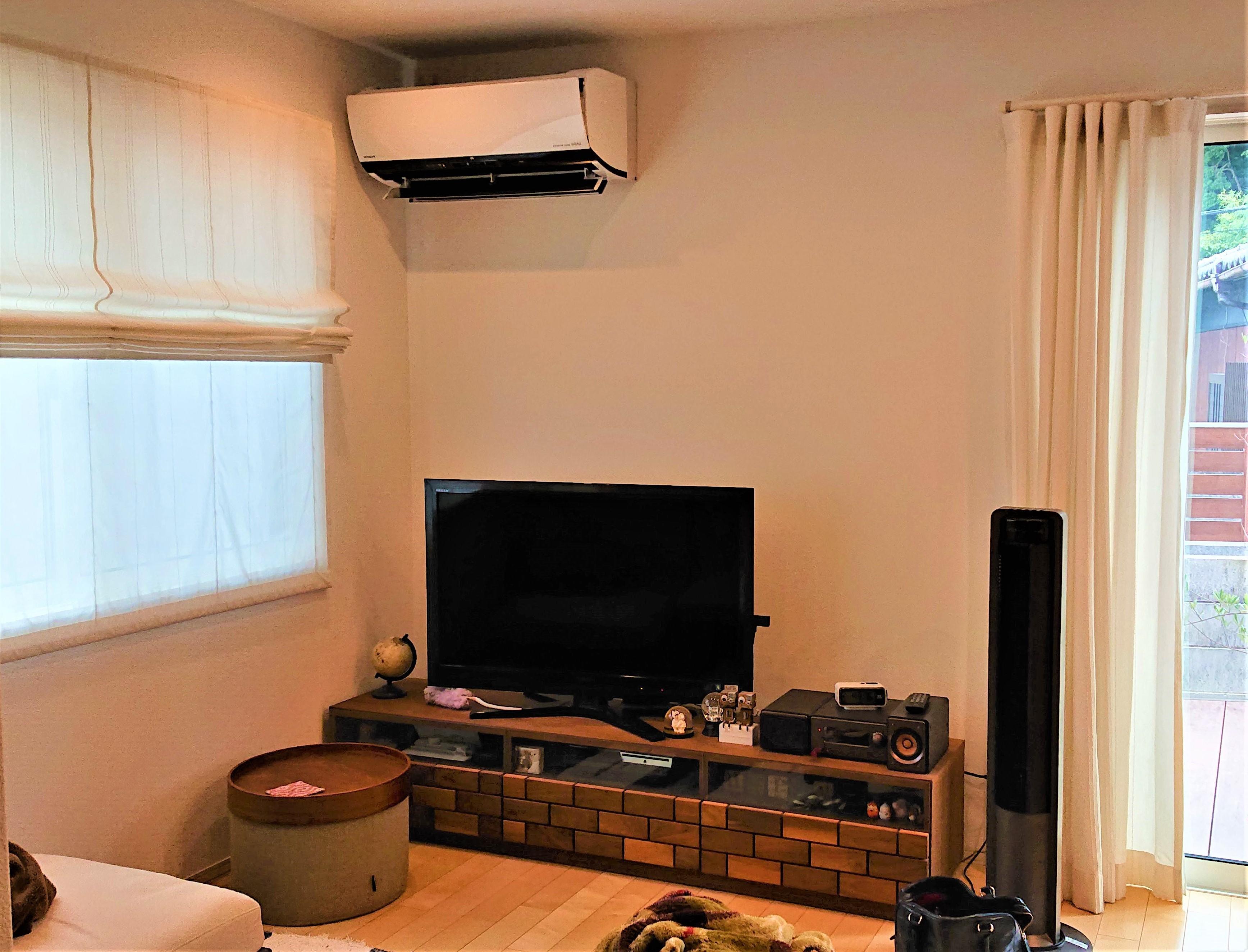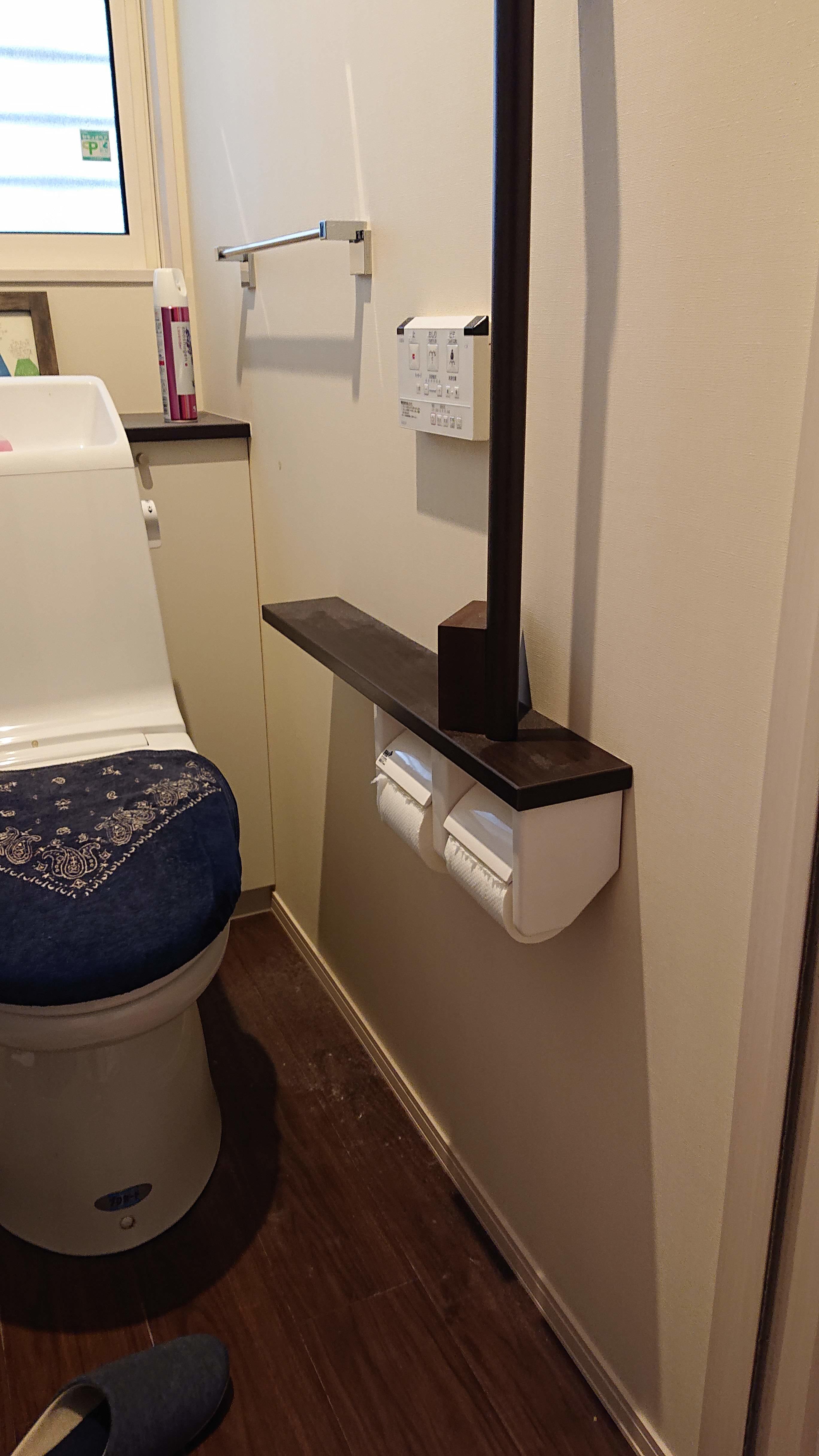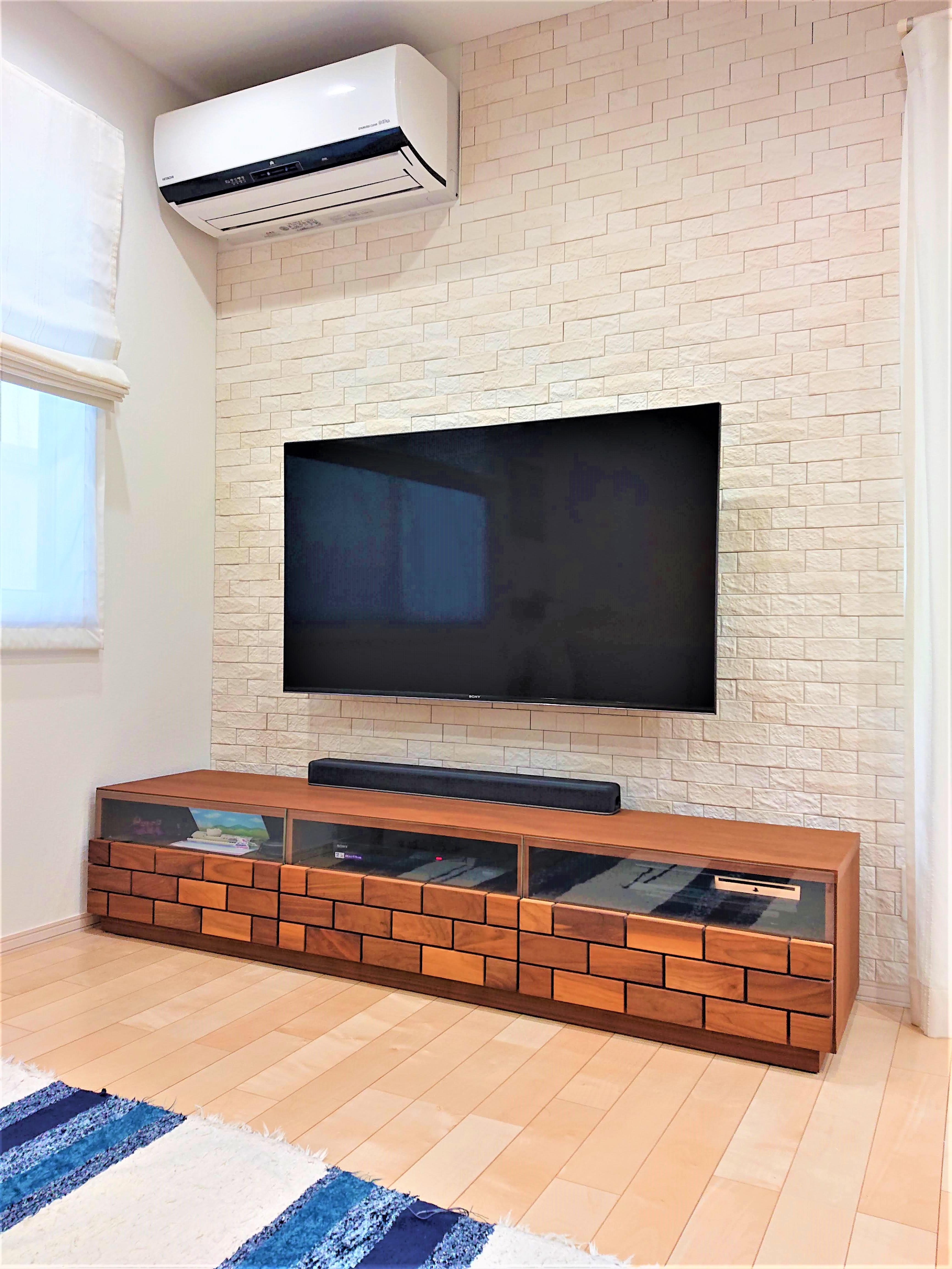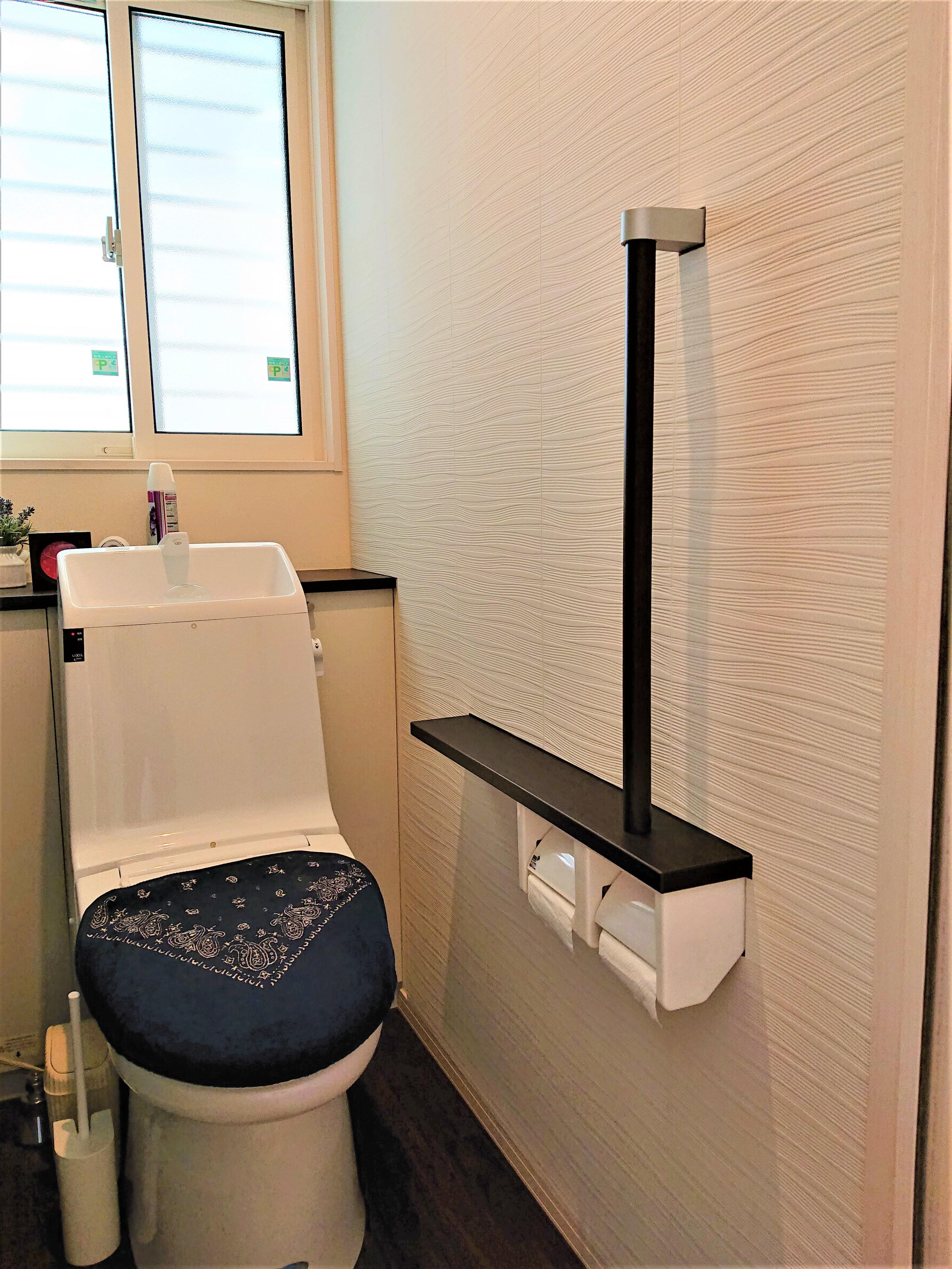 テレビを壁掛けにするための壁補強工事と同時に、壁一面にエコカラットを貼りました。エコカラットは、湿度が高い時は湿気を吸収し、乾燥している時は湿気を放出して、いつも快適な湿度を保ってくれます。さらに、おうちの気になる臭いを脱臭してくれる効果もあり、トイレの壁にもエコカラットを貼りました。