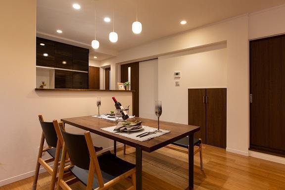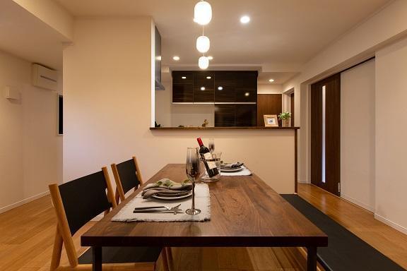 もともとの広さを利用して、間仕切りを可能な限り外し、開放的な空間になるようご提案しました。対面キッチン越しに、家族の様子を見たり、テレビを見たり、家事も楽しくなりそうです。