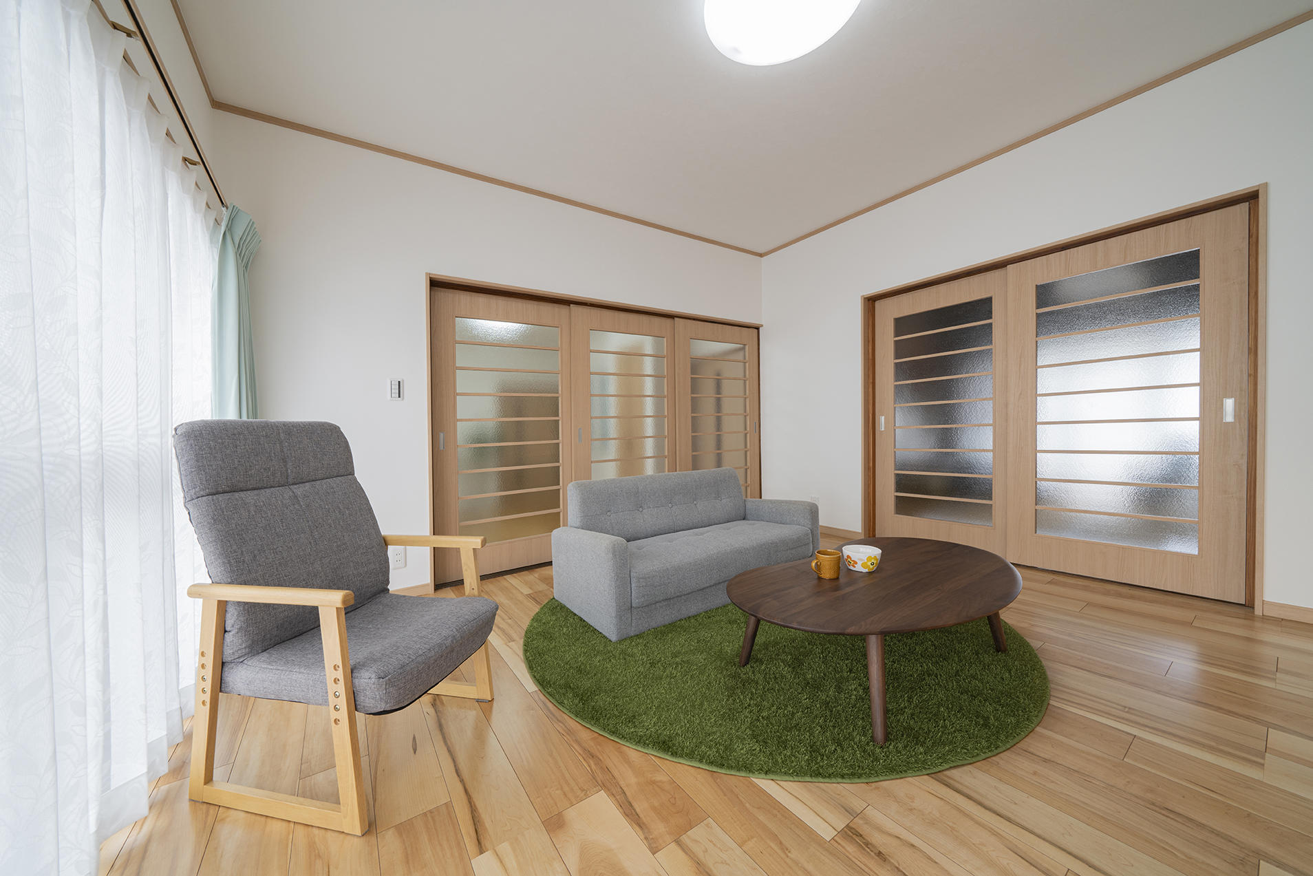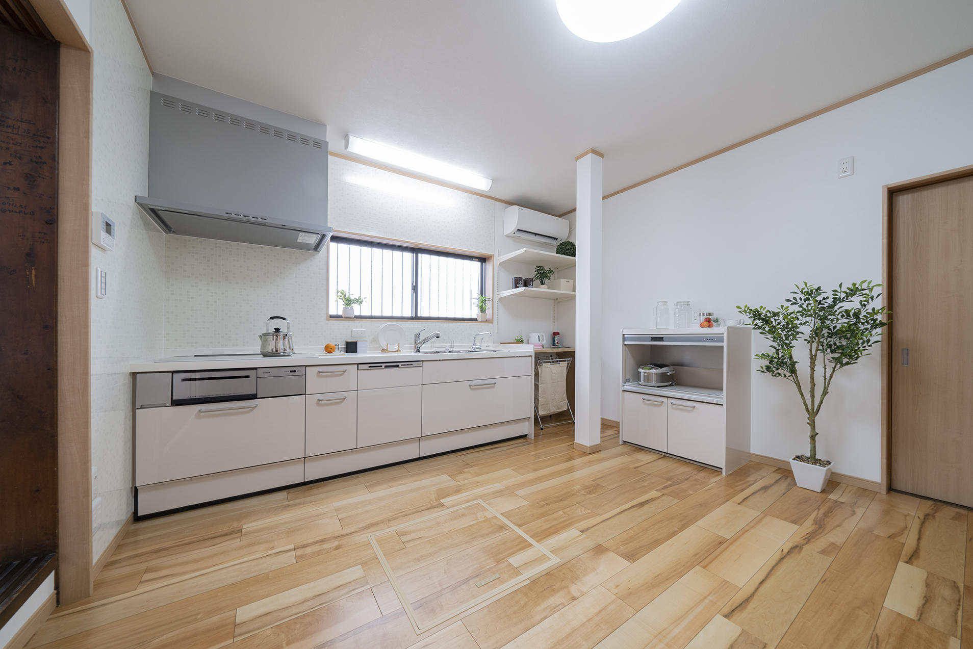 フローリングと建具を淡い色合いで、キッチン設備とクロスを白で統一することで、日の入りにくい北側の部屋が明るい空間に生まれ変わりました。