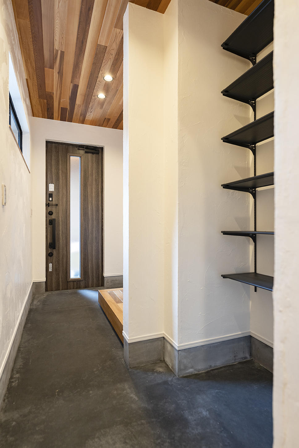 来客用と家族用で上り口を分けた玄関は、シューズクロークだけではなくコートやバッグが収納できます。リビングにウイルスや花粉を持ち込みまないよう、奥にはすぐに使える玄関手洗いを設置しました。