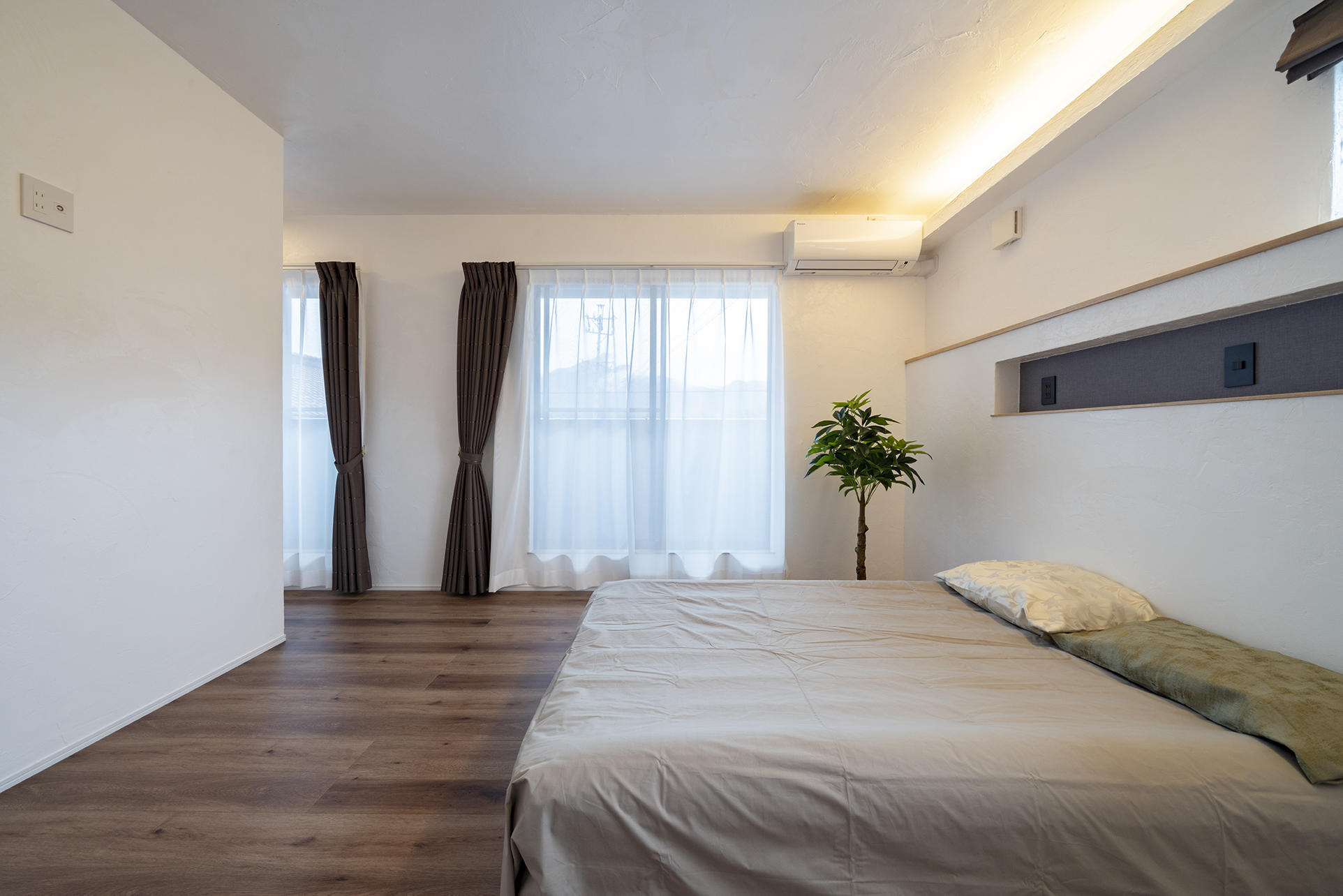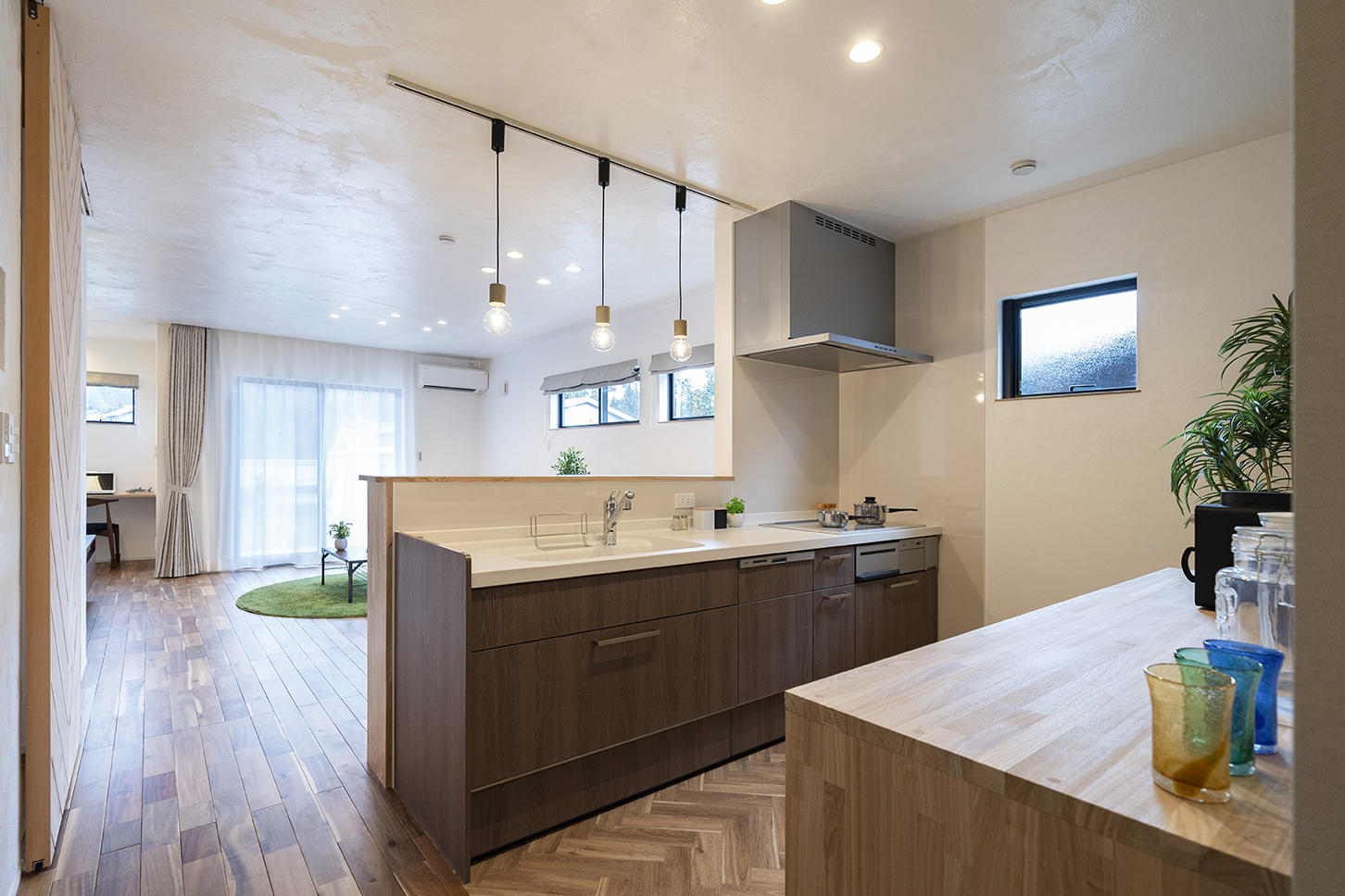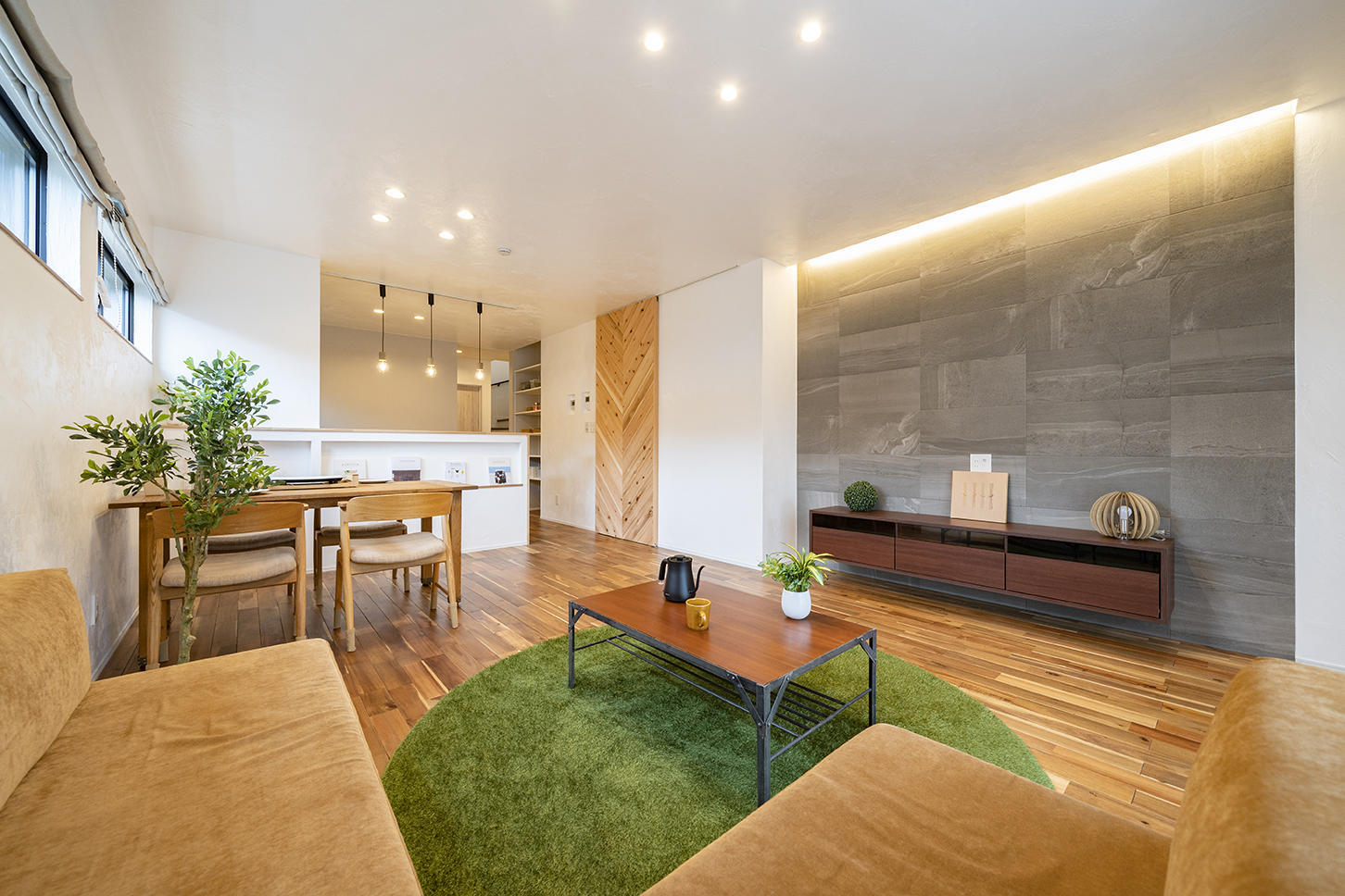 LDKはスッキリとした空間を演出するために、天井高まである建具やカーテンレールを天井に埋め込みました。