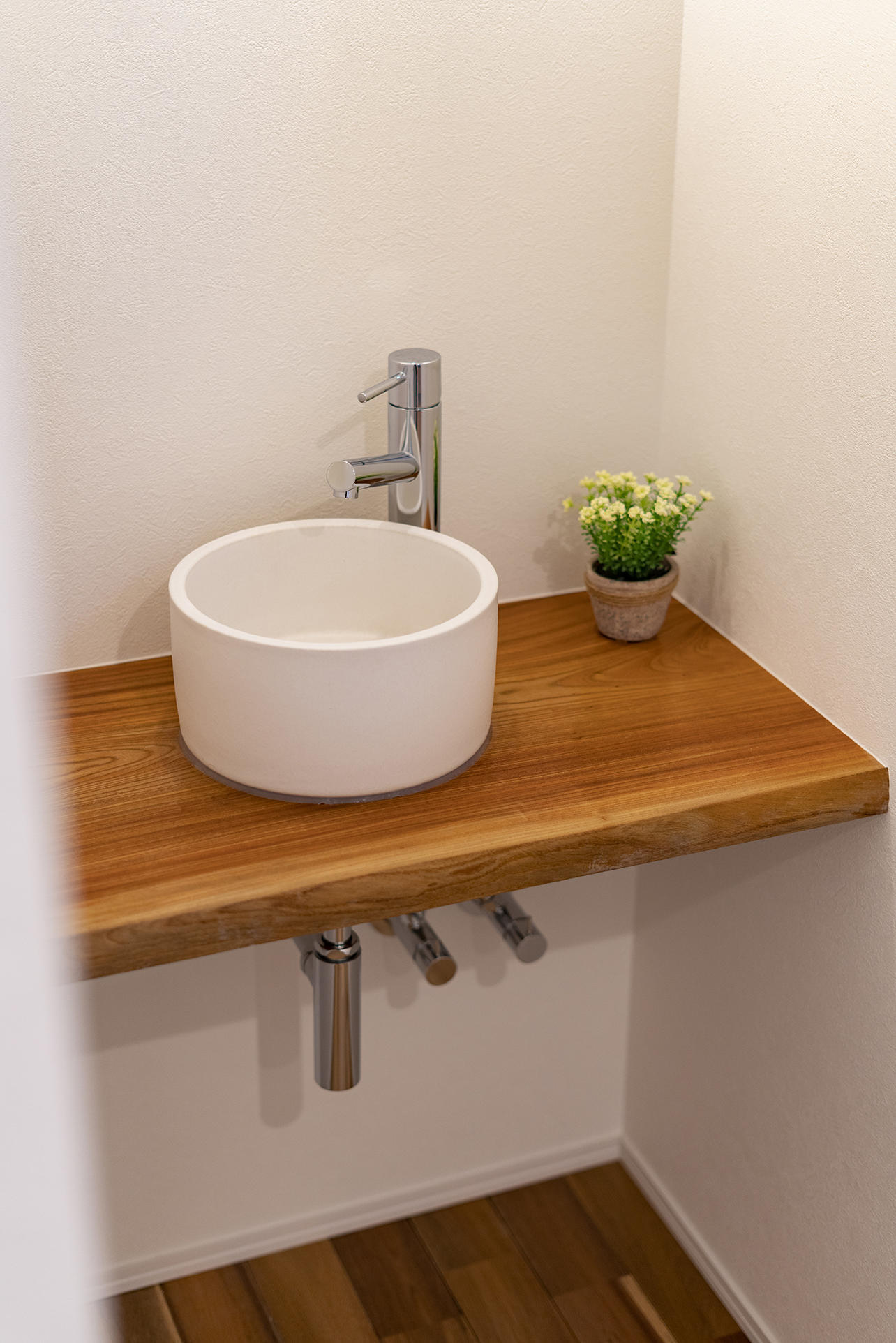 アールの垂れ壁やなめらかなフォルムの洗面台など、ひとつひとつのディテールにもこだわった新居となりました。