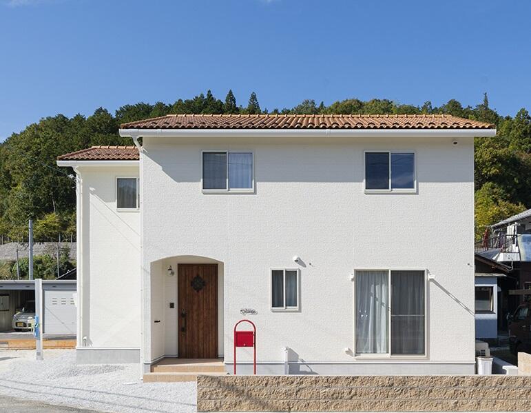 白い壁にイエローのタイルと屋根瓦。南欧をイメージした明るい住まいが完成しました。